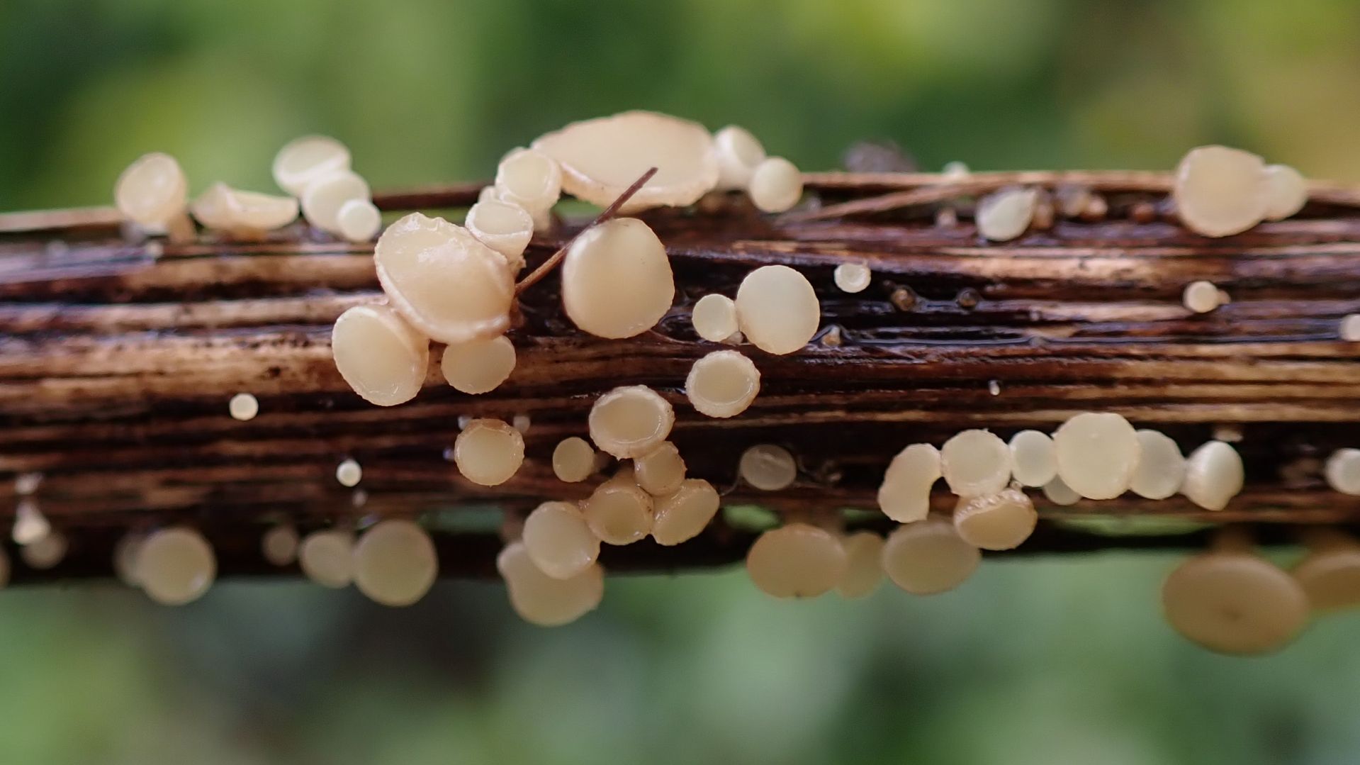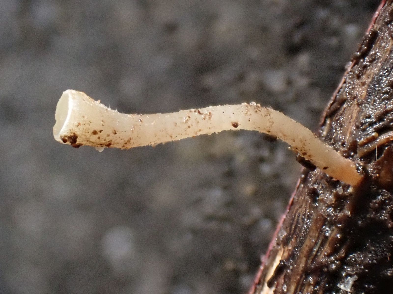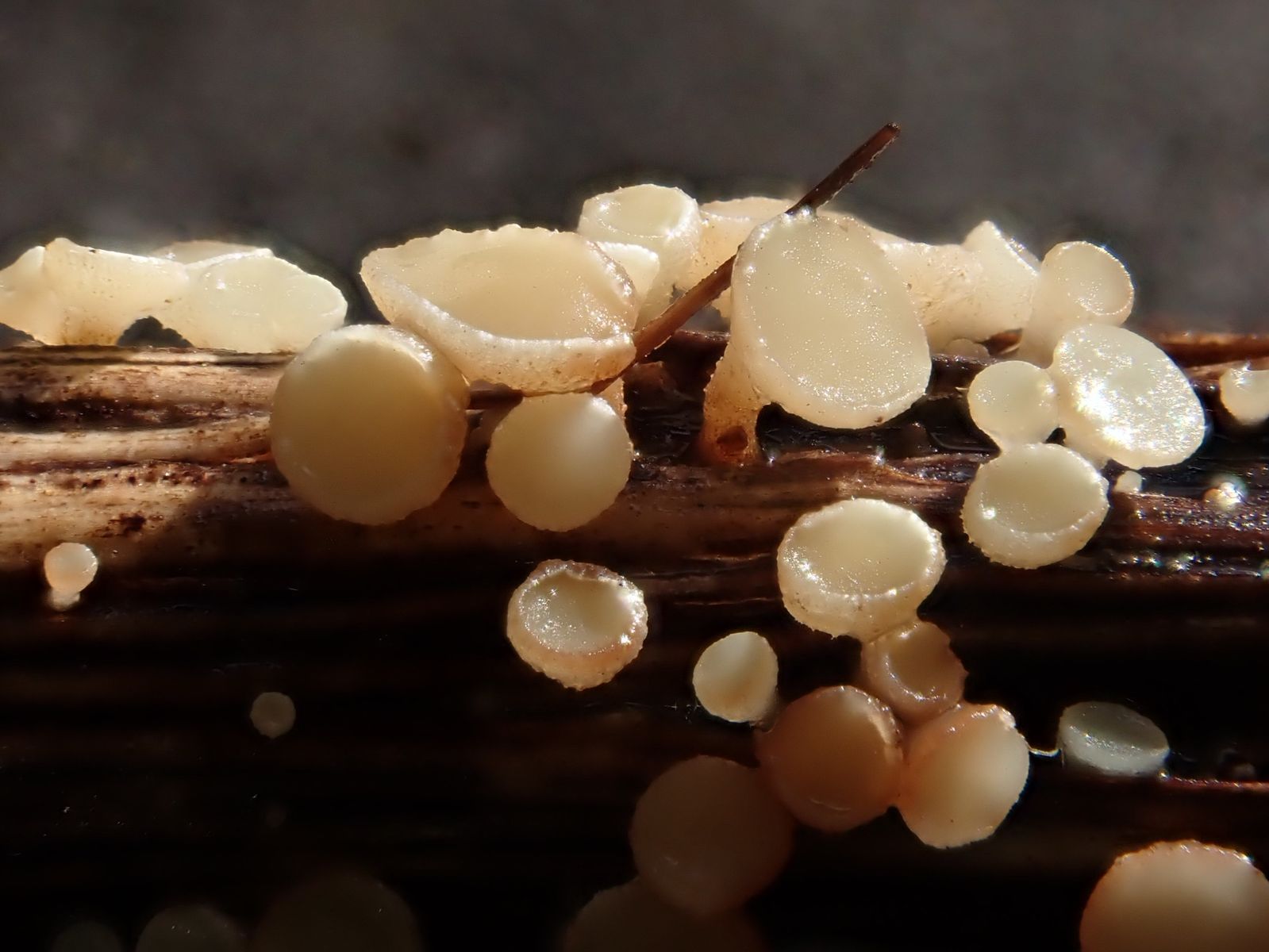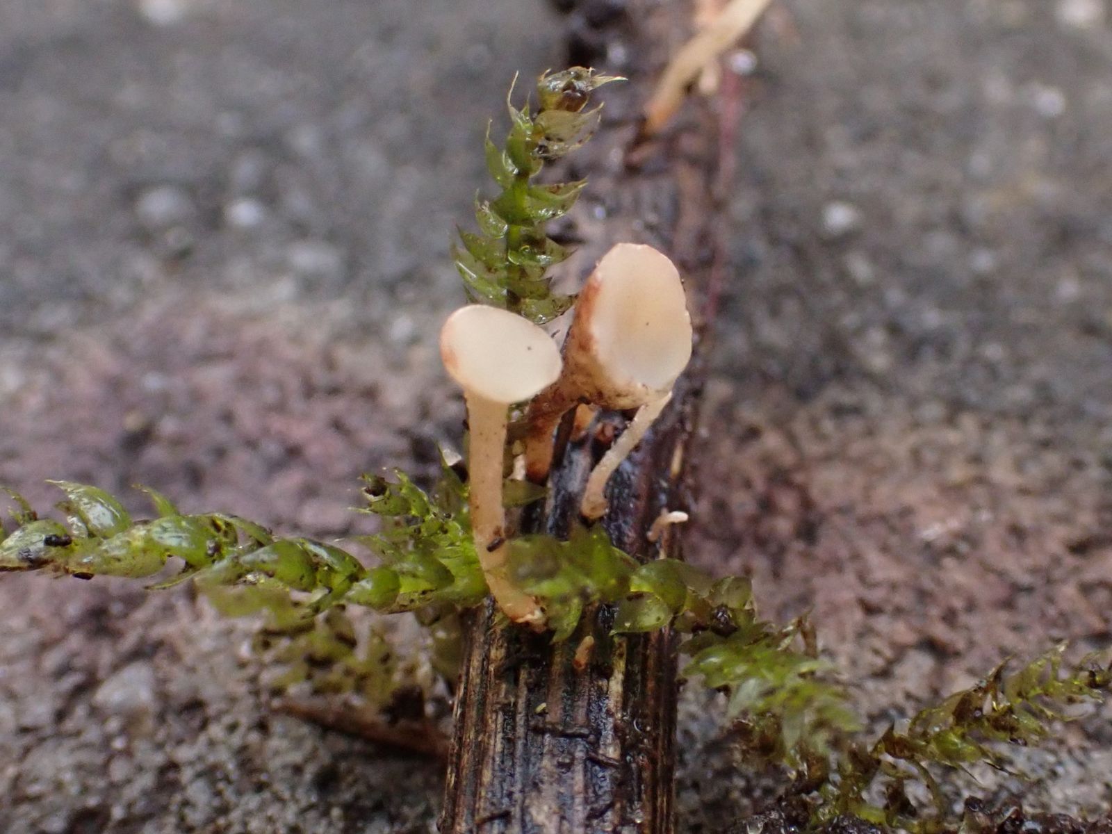 auf einem am Boden liegenden (Laubholz)ästchen wächst dieser winzige Pilz.