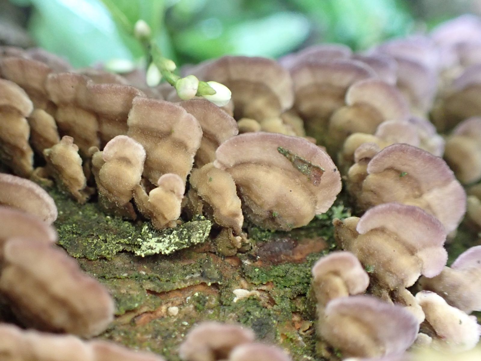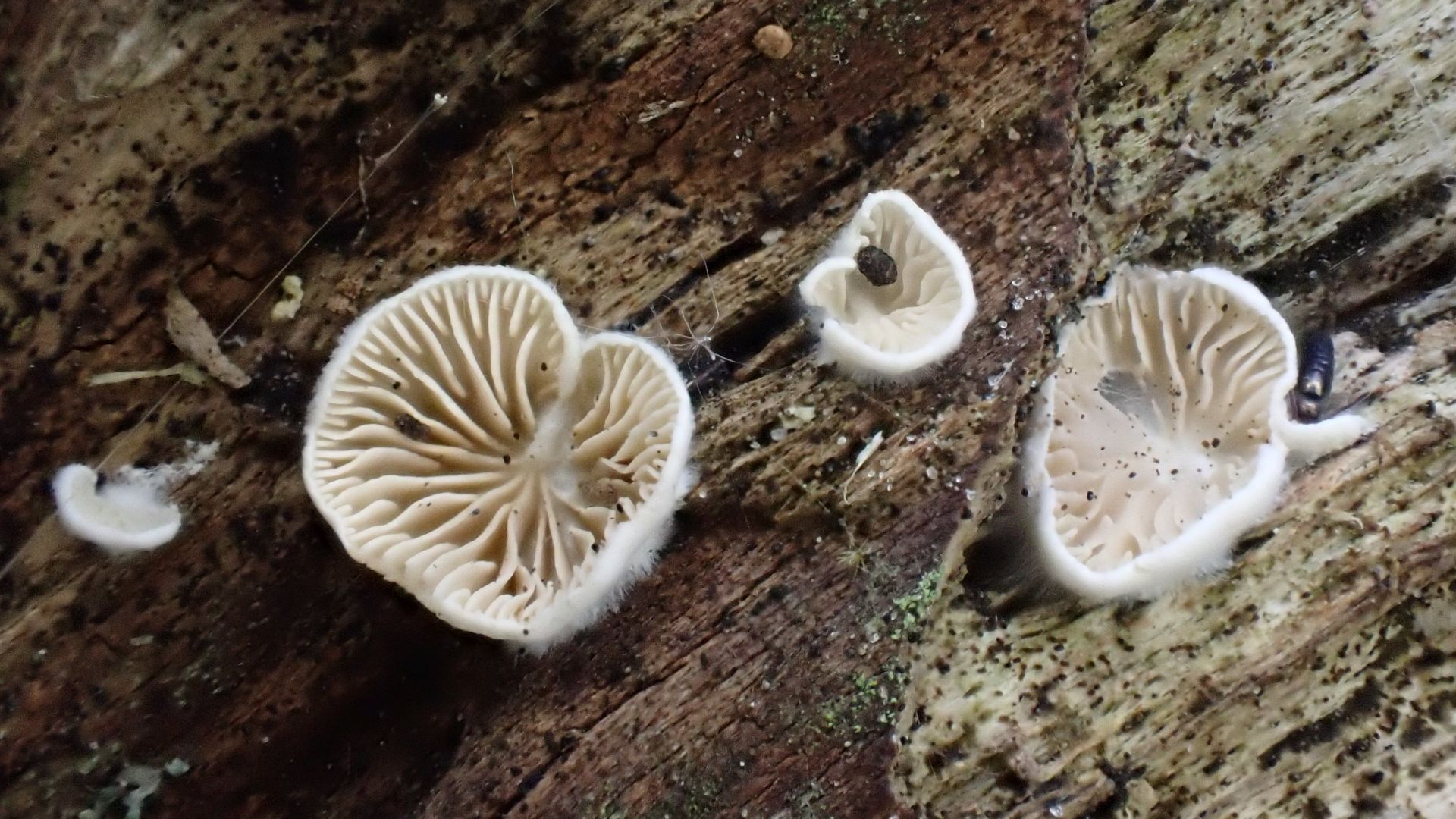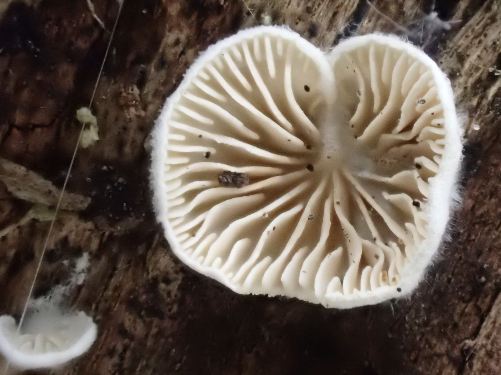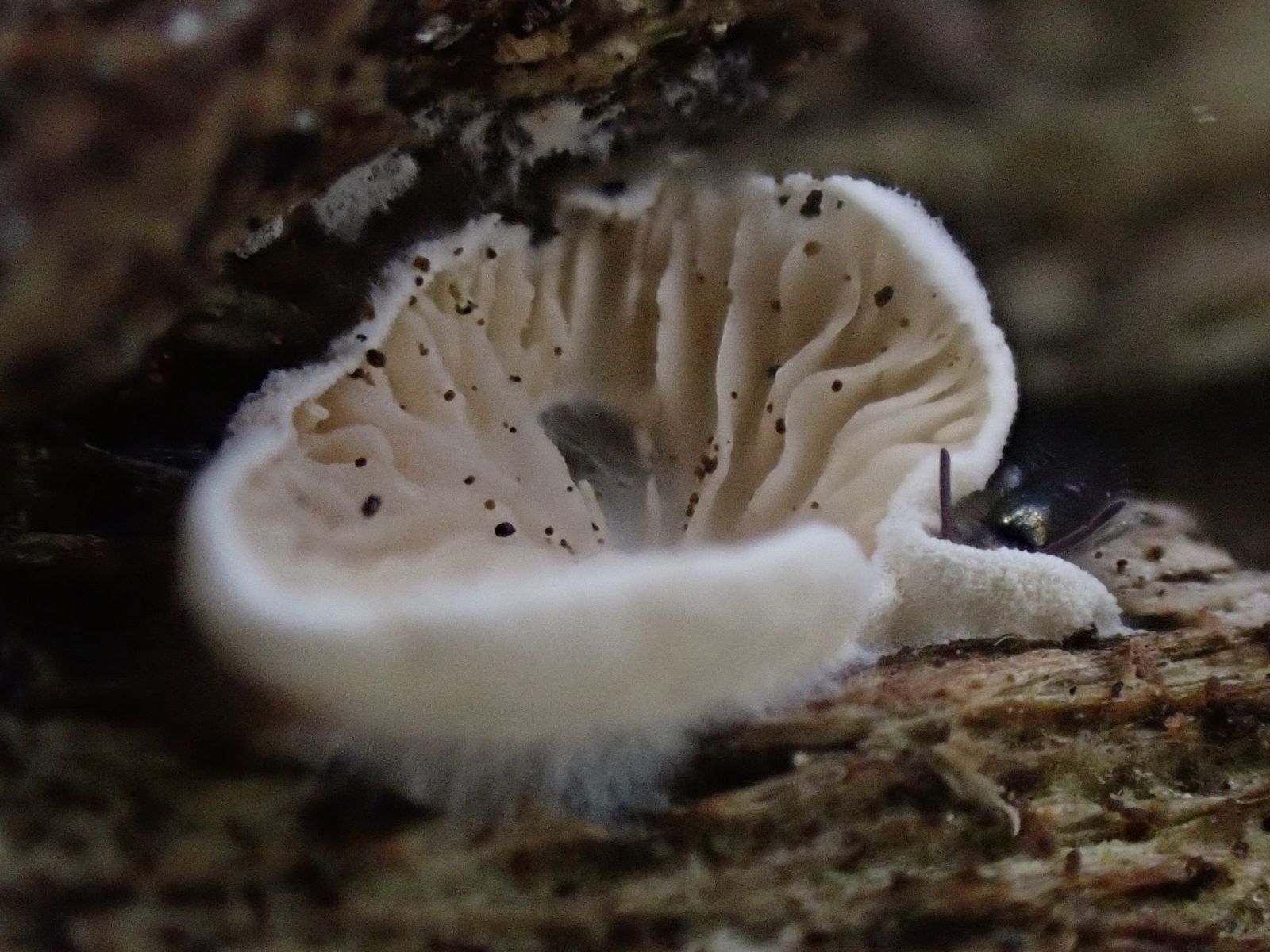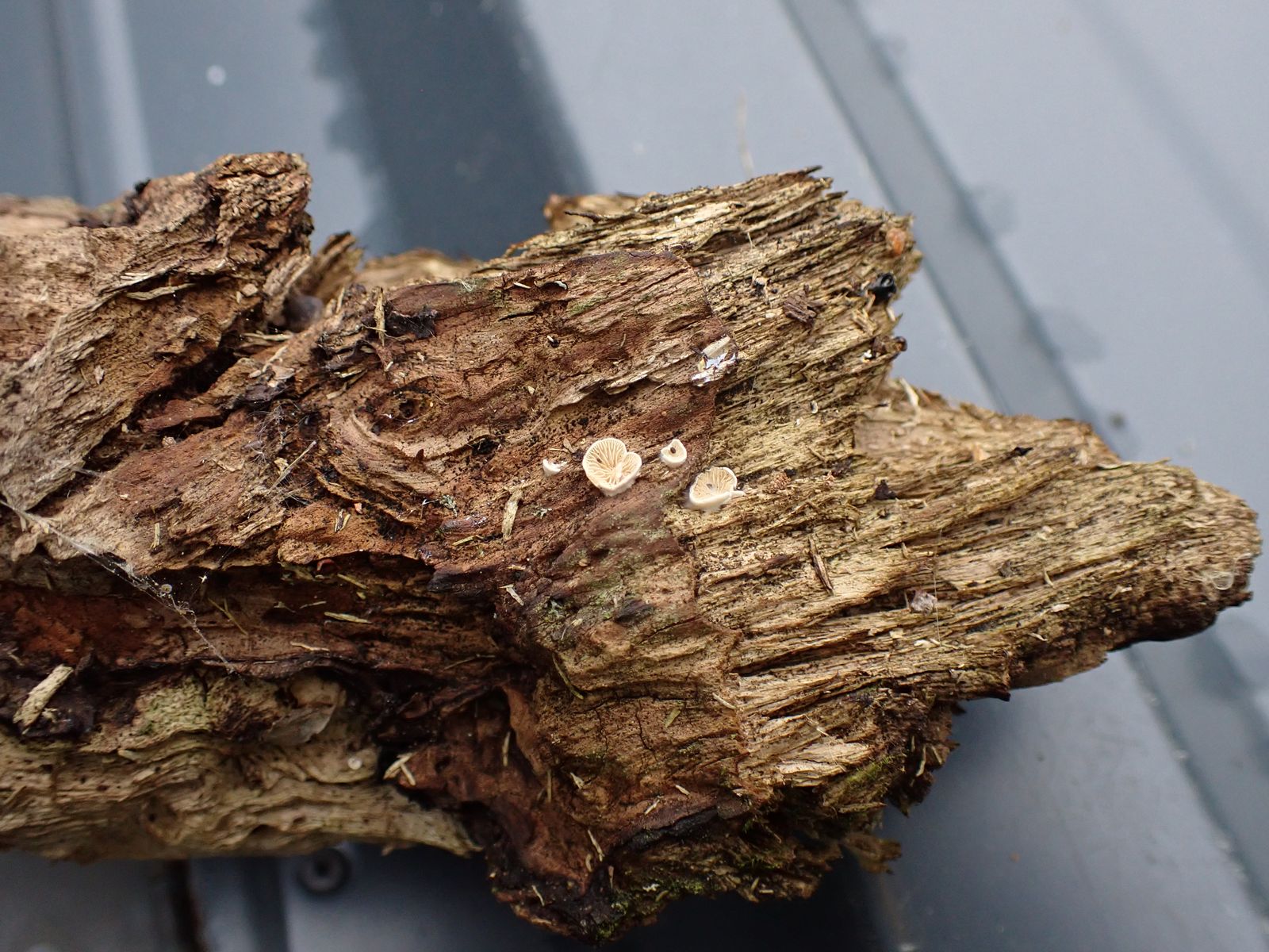 gestern Morgen habe ich auf einem alten Ast im Garten einen kleinen weißen Pilz gesehen, eben fotografiert, und nicht weiter dran gedacht.