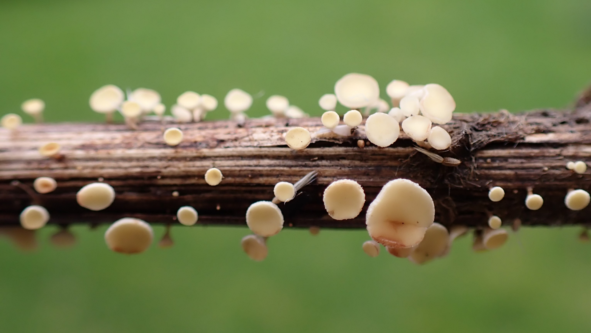 diese kleinen Becher habe ich vor unserer Buchenhecke auf verrottenden, letztes Jahr abgeschnittenen Stängeln von Solidago canadensis gefunden.