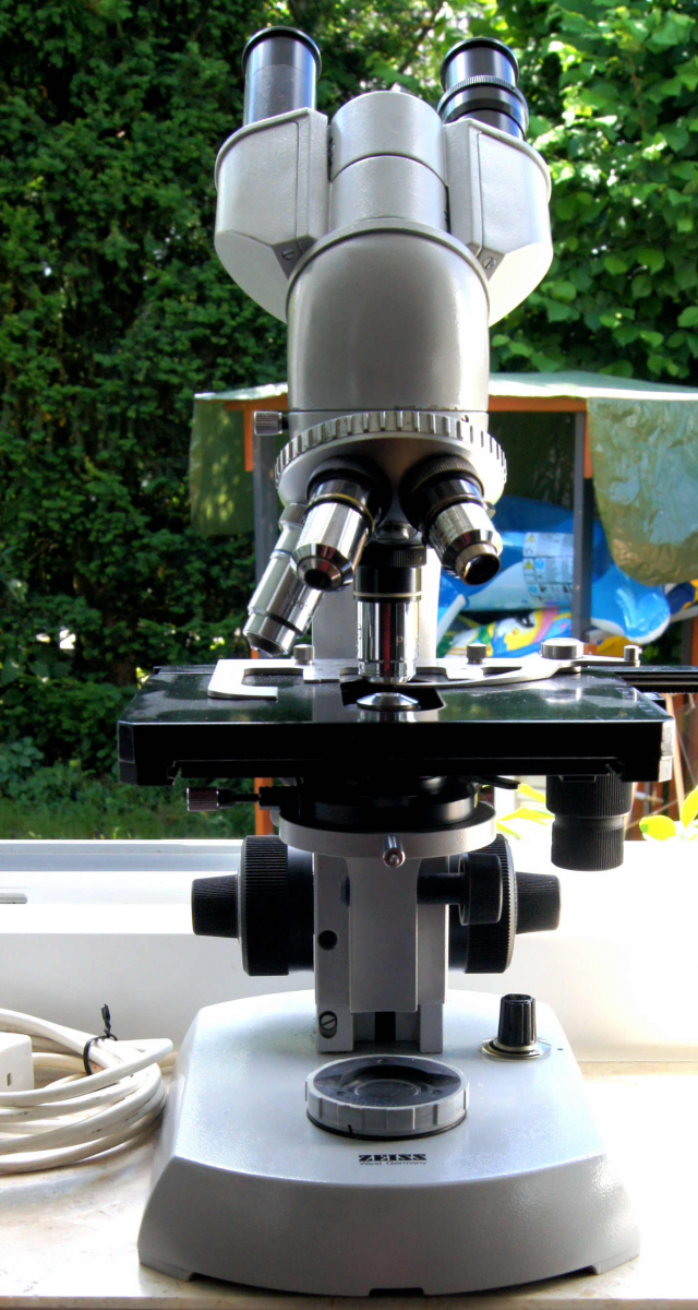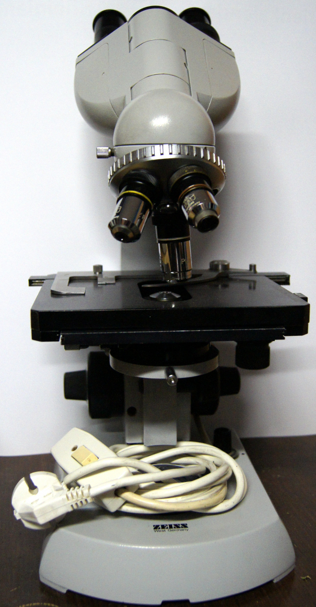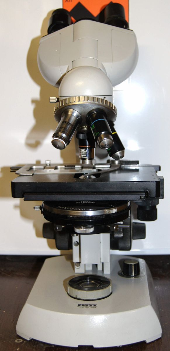 Das andere Gerät ist ein Zeiss Lab 06 mit Phasenkontrast und Dunkelfeld. Es hat drei Objektive (10er, 40er und 100er), Binokulartubus , Halogenbeleuchtung und Kreuztisch.