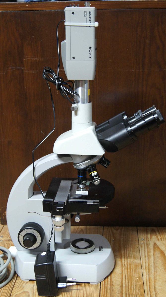 biete ein Zeiss Standard mit 4fach Objektivrevolver mit 3,2er; 10er und 40er Objektiv, Großfeldokulare, Trinokulartubus (Fremdfabrikat) mit Videoanschluß und Videokamera (wie abgebildet), eingebaute Halogenbeleuchtung und Klappkondensor (0,9er). Die Leuchtfeldblende schließt nicht ganz rund, funktioniert ansonsten aber.