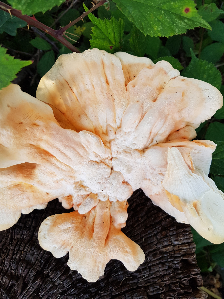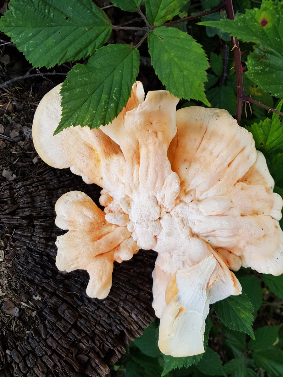 Ich habe heute Mittag diesen Porling gefunden. Ich dachte flüchtig an schwefelporling aber dieser hier ist überhaupt nicht schwefel gelb. Der FK war nicht alt, alte schwefelporlinge sehen nicht so kräftig in Farbe aus , dieser hier ist recht frisch. Riesenporling vieleicht, aber das schwärzen an den bruchstellen sehe ich komplett nicht. Der FK ist an einem laubstumpf gewachsen die genaue Art ist nicht mehr zu erkennen. Vielleicht weiß hier einer von euch mehr dazu.