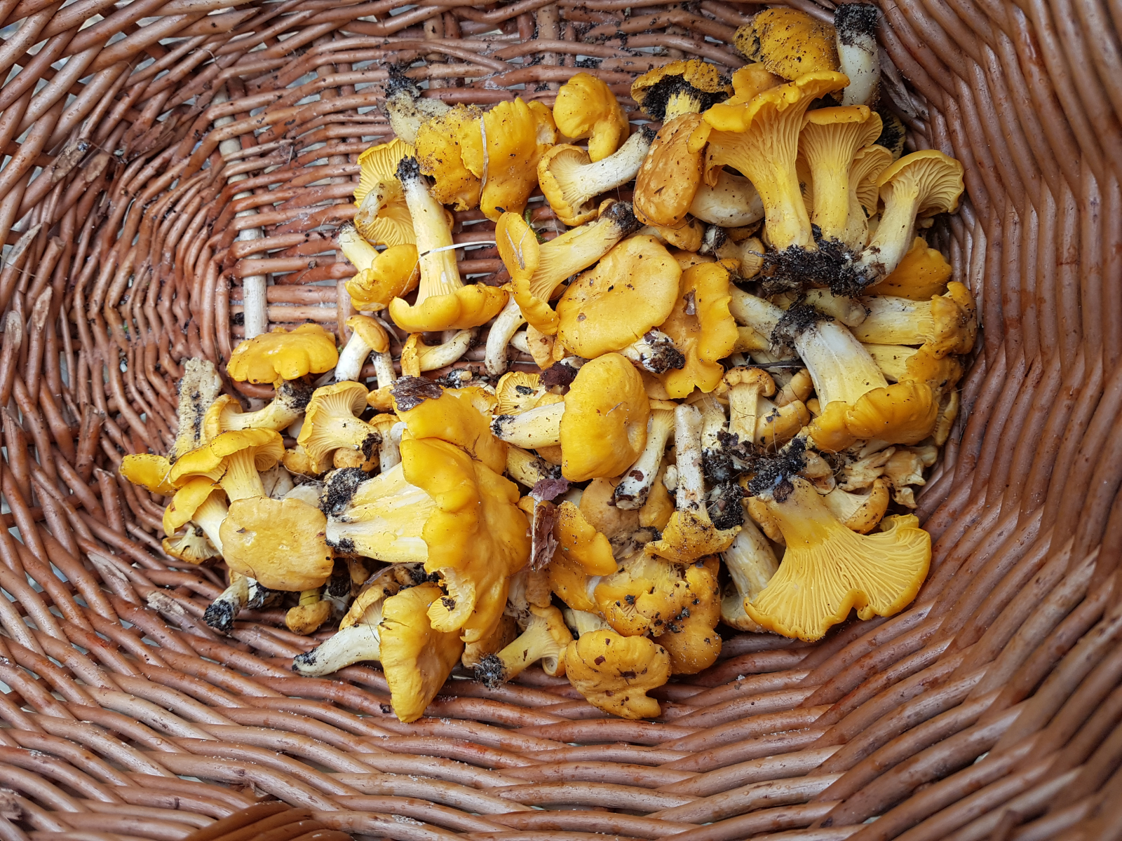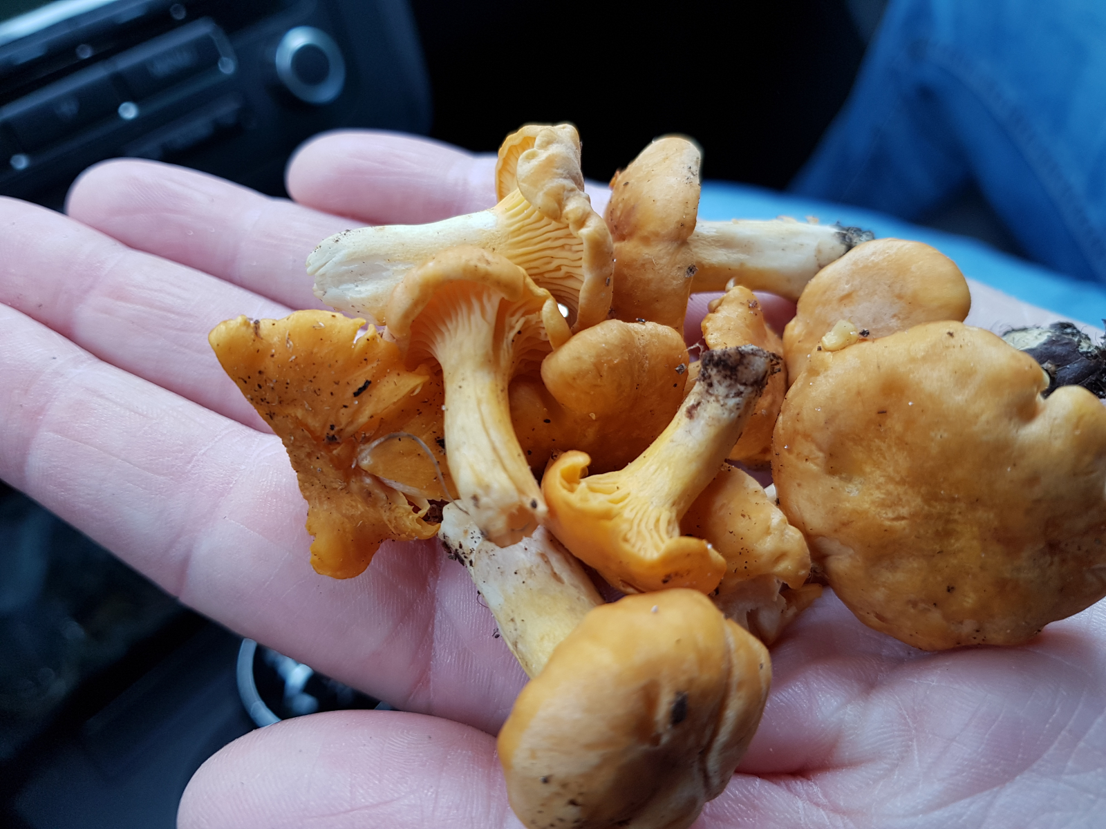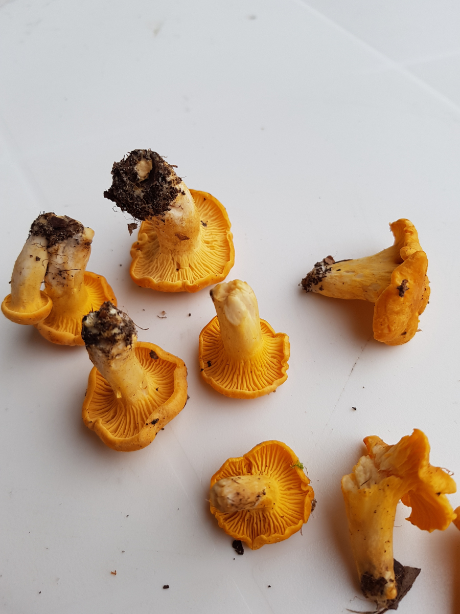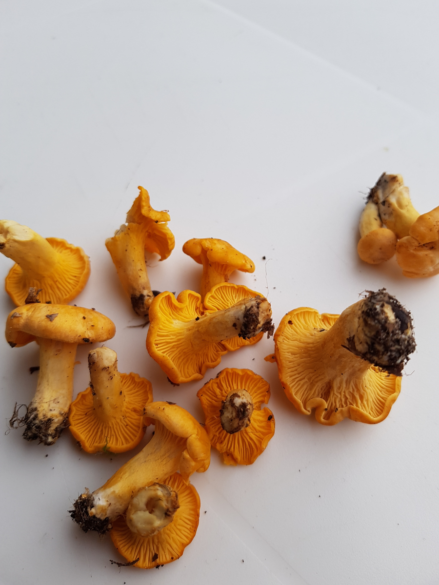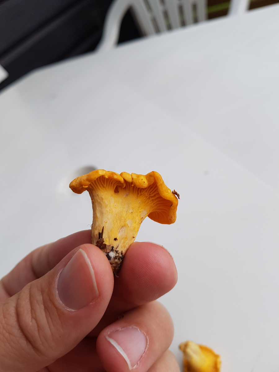 Es sah erst so pilzleer hier aus und dann sah ich diese gelben Köpfe. Ich hab den ersten umgedreht und da war es klar es sind Pfifferlinge.