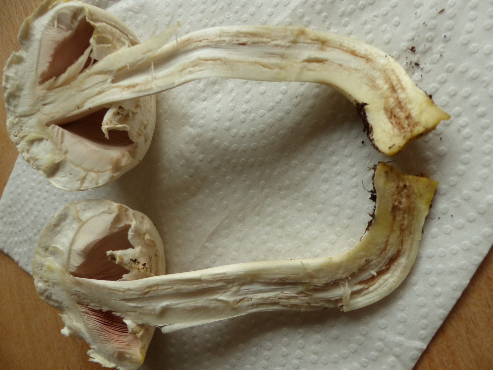 Fruchtkörper ist entsorgt, Sporenabdruck geht nicht mehr. Aber Maipilz kann ich kaum glauben. Hab mal von Pablo gelernt, dass das Verhältnis von Lamellen zu Hut beim Maipilz sehr charakteristisch ist, so 1 zu 3 oder 1 zu 5. Im Schnittbild von meinem Unbekannten kann man eher 1 zu 1 oder 2 zu 1 sehen.