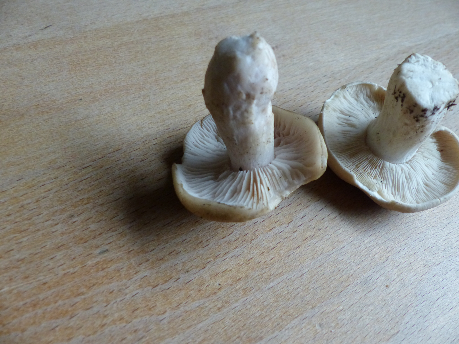 heute war ich Maipilze suchen. An einer mir neuen Stelle habe ich aus der Entfernung ein Büschel Pilze gesehen. Jubel! Neue Stelle (ich verschenke mittlerweile alle Maipilze seit diesen Erfahrungen Unverträglichkeit bei Maipilze, aber man kann sich ja auch für andere freuen). Hab mich dann bis zum Fundort durchgekämpft, war nicht ganz einfach, sich einen Weg durch das Dickicht aus Birken, Brombeeren und Obstbüschen (könnten Kirschen, Schlehen, Mirabellen oder Quitten gewesen sein) zu suchen. Die kleinen Exemplare sahen dann aber so gar nicht nach Maipilzen aus, hatten alle einen Buckel. Habe dann das größte Exemplar entnommen. Lamellen waren auch nicht wie Maipilze. Geruch war zumindest nicht weit weg von Maipilzen, vielleicht etwas weniger penetrant und etwas obstartiger. Hab den Unbekannten dann zusammen mit einem Maipilz fotografiert, links der Unbekannte, rechts ein Maipilz (sind dieses Jahr wohl wegen der Trockenheit ziemlich klein und kompakt).