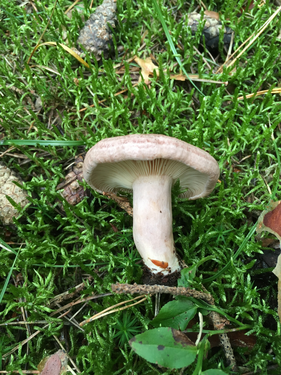Hut: Durchmesser 6 cm, vorwiegend blass cremefarben mit Mischfarben, bei einigen Exemplaren mit gemischen graulila am Hutrand, Huthaut ~ zu knapp 1/2 des Radius abziehbar, Fleisch unter der Huthaut ungefärbt