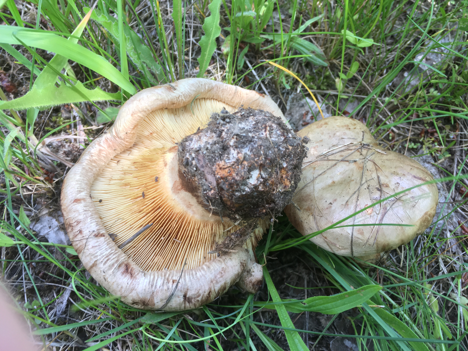 Stiel: Überraschend stämmig, fest und kurz. An der Basis mit fest anhaftenden Erdpartikeln. Ein jüngeres Exemplar zeigt auch an der Basis ein rötliches Exudat (beim Rest wahrscheinlich witterungsbedingt eingetrocknet).