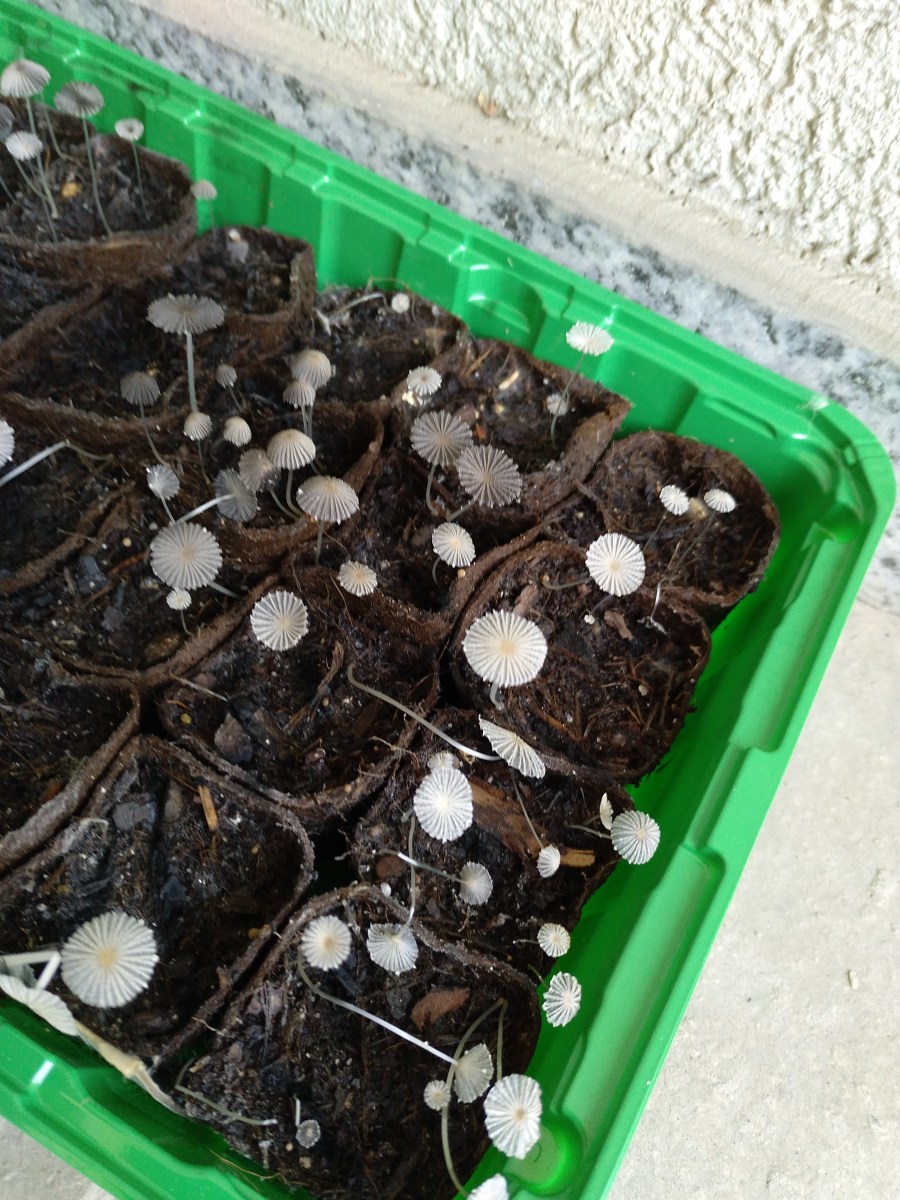 Um den Thread wieder aufleben zu lassen: Ich nehme an, ich habe ähnliche Pilze in meinem Aufzuchtbeet. Hier ein etwas schärferes Foto als das vom OP. Sie sind noch nicht ausgerissen, also kann ich wohl später auch noch ein paar Fotos von "ausgewachseneren" Pilzen machen.