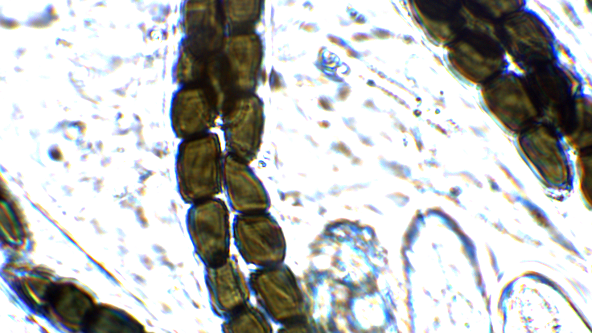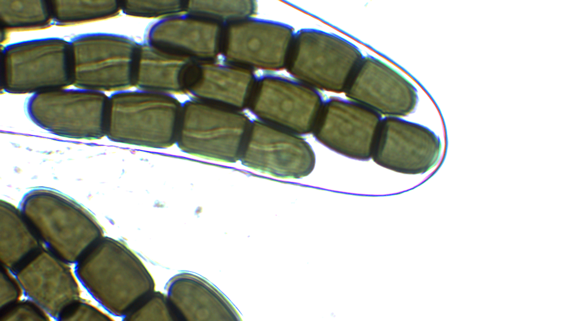 Die Sporen waren zwischen 11-12,5X6-7,7 groß. Viele waren noch am unteren Rand (oder darunter) von dem, was c. sexdecimsporus eigentlich haben sollte, aber ich denke mal, dass sie einfach noch nicht reif waren. In den Asci waren 16 Sporen.