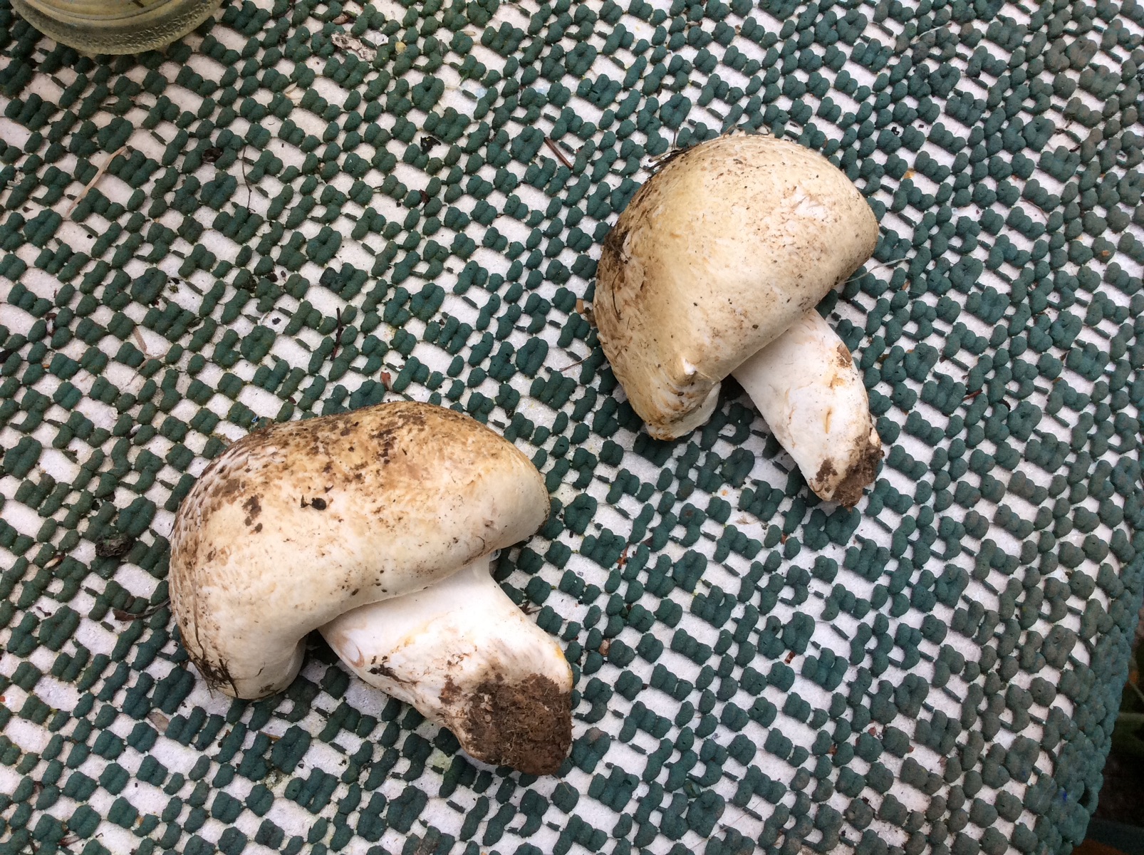 Bei dem ersten denke ich es ist ein altes und junges Exemplar Karbol-Egerling. Wuchs auf Waldboden in einem Park direkt nebeneinander. Farbe an der Stielbasis fand ich auffallend.