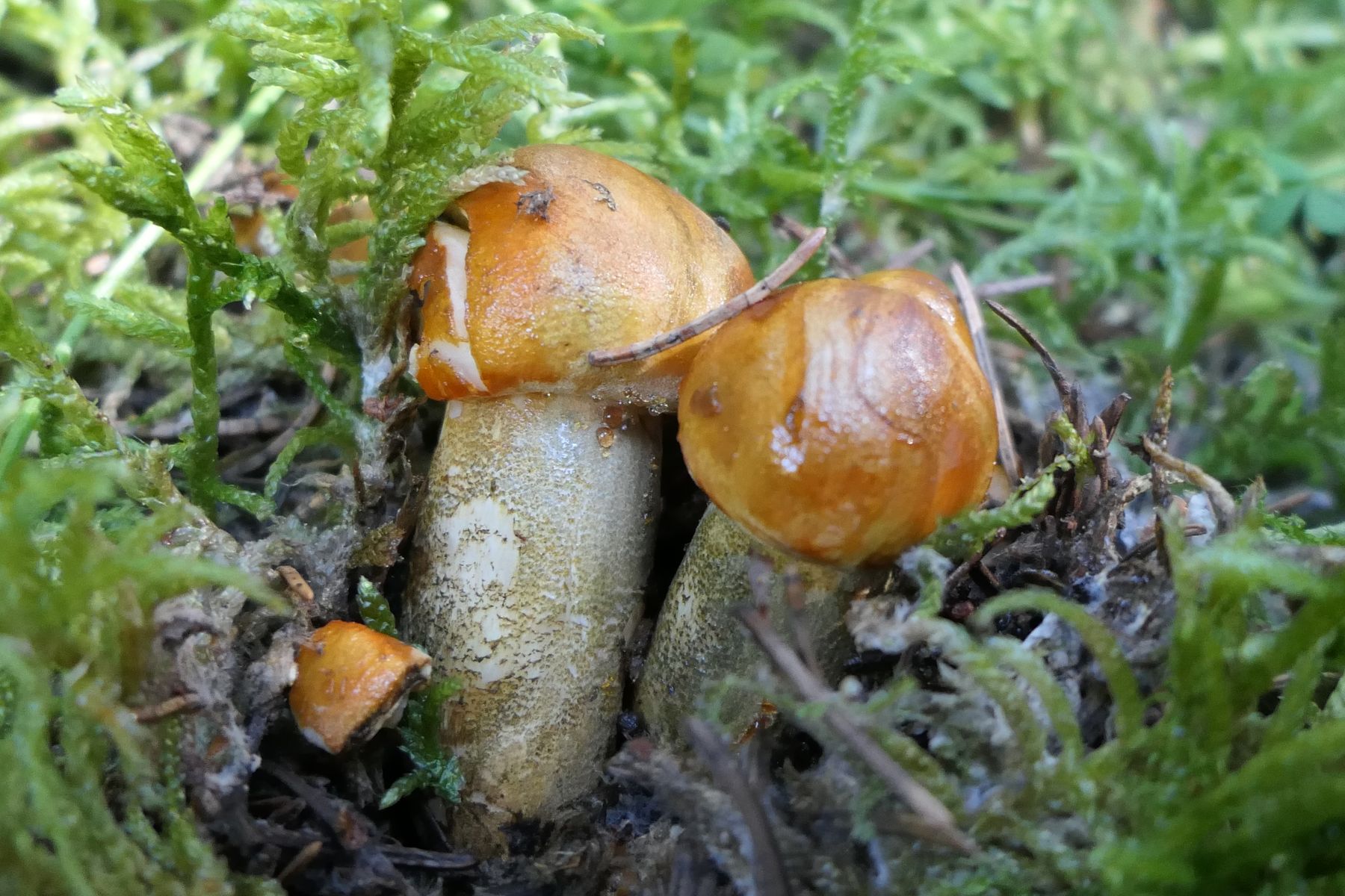 02 Gomphidius maculatus - den gefleckten Schmierling bei 03 Suillelus grevillei - dem Gorldröhrling (die hatte ich allerdings erst abends an einer Waldkante unter Lärchen):