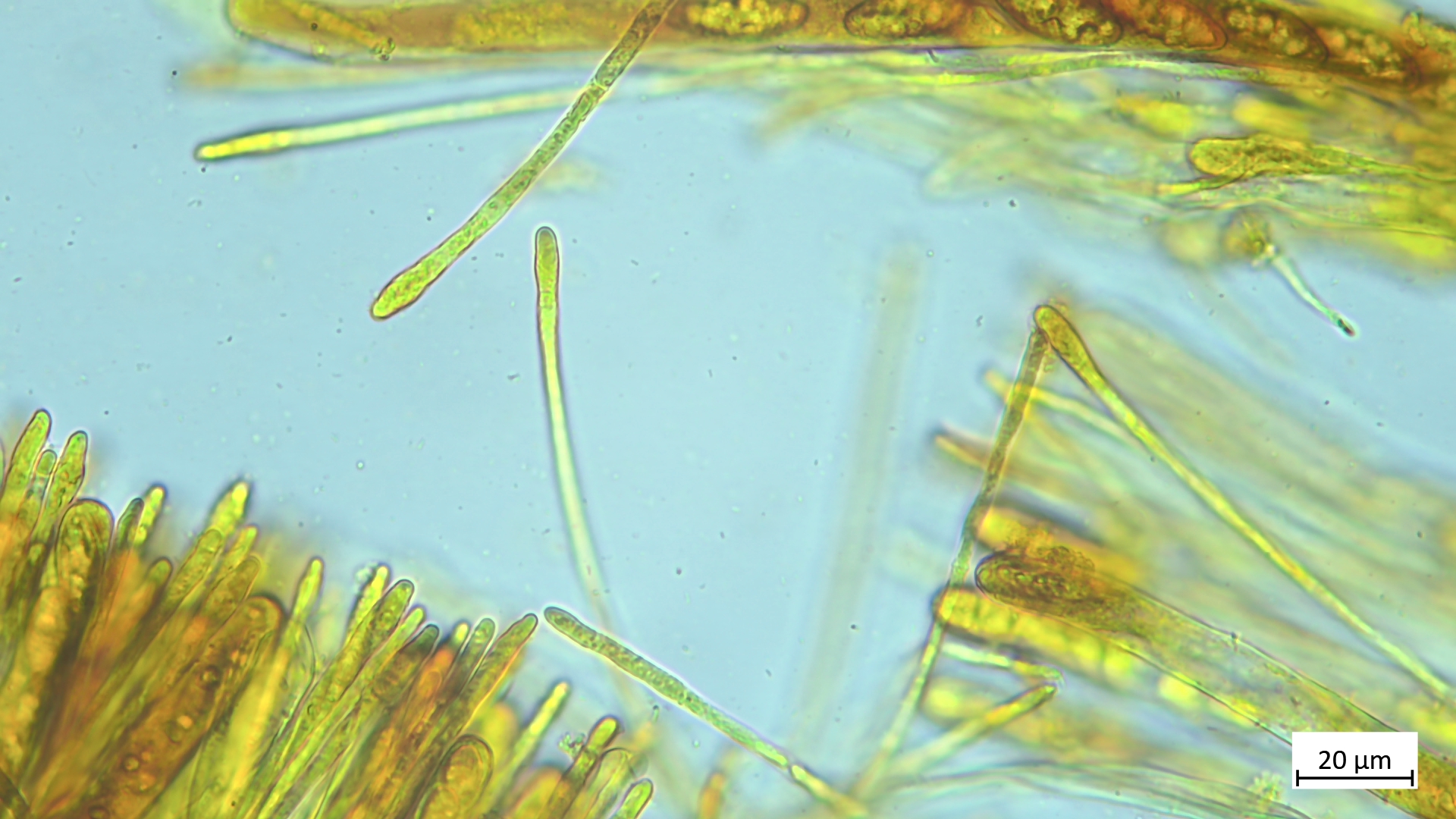 Pseudozystiden wie beschrieben in KOH 3% mit goldgelbem körnigen Inhalt: