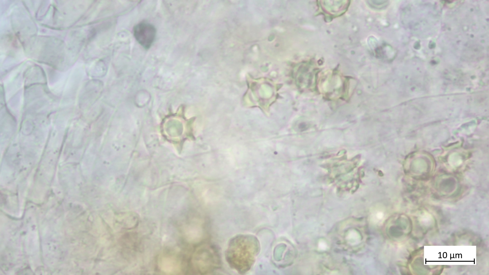 Sporen (immer einzeln im Bild, aber überall zu finden, winzig, subglobos, mit ganz zartem Ornament, das kaum mit dem Aug zuerfassen ist durchs Mikro unter 1000 Ölimmersion, geschweige denn auf den Bildern festgehalten werden kann):