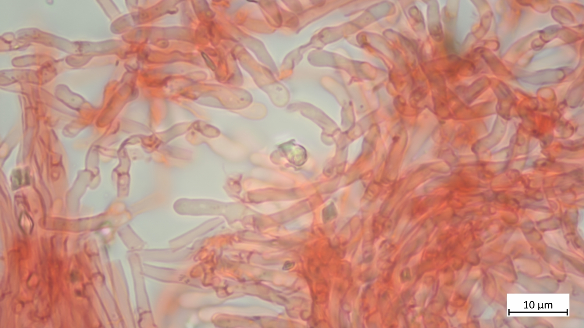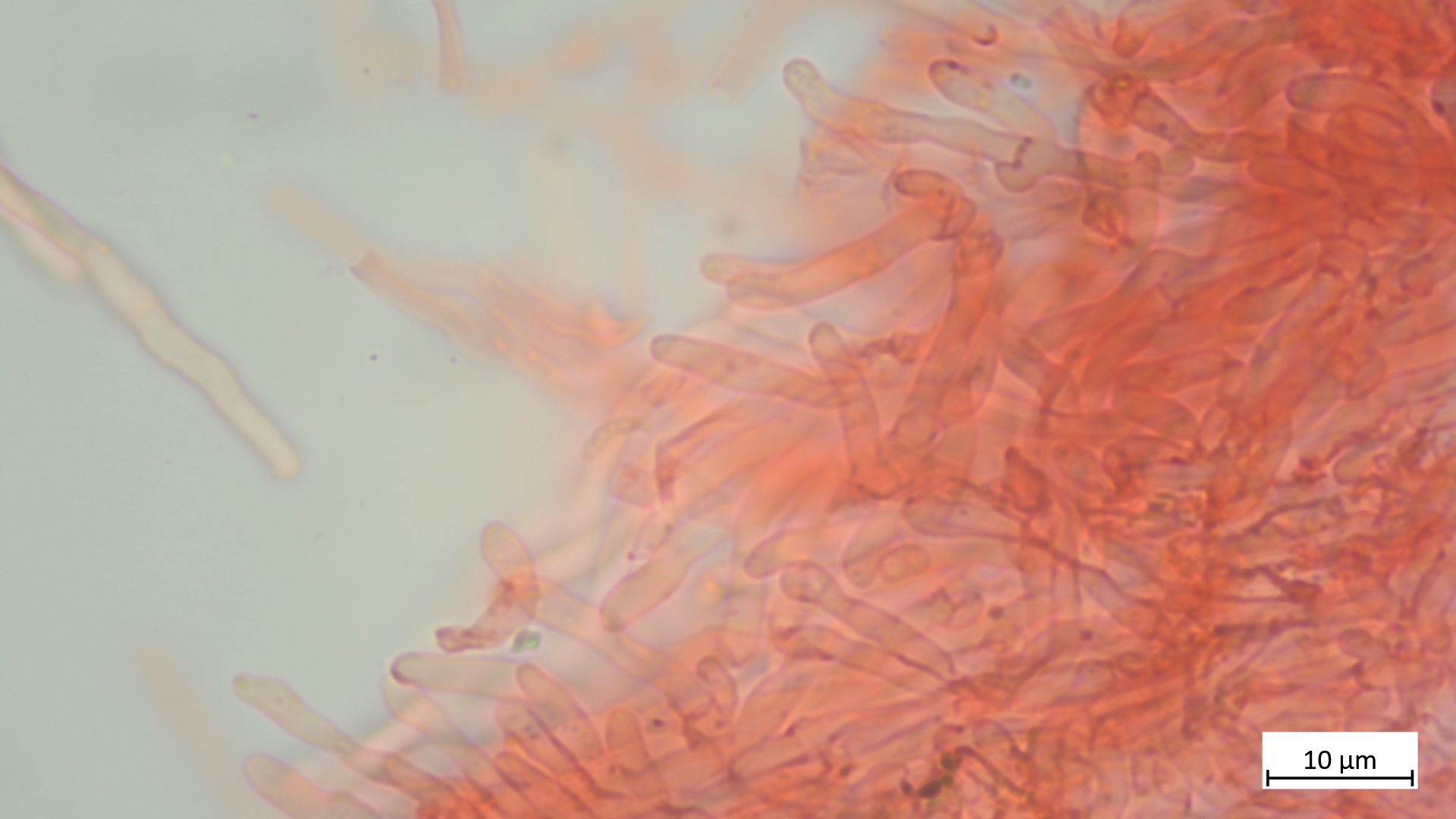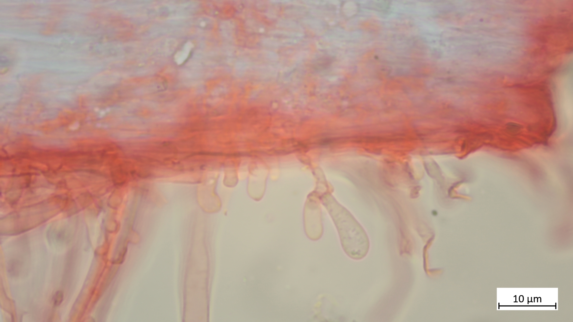Bei einer Melanoleuca hatten wir überlegt, ob es brevipes sein könnte wegen des Habitus mit kurzem Stiel. Die weiße Behaarung am Stiel ist aber wohl schon kein schlechter Hinweis auf M. humilis. Und in der Mikroskopie fanden sich dann auch fusiforme Zystiden, was humilis bestätigt und brevipes ausschließt (der hat Brennhaarzystiden).