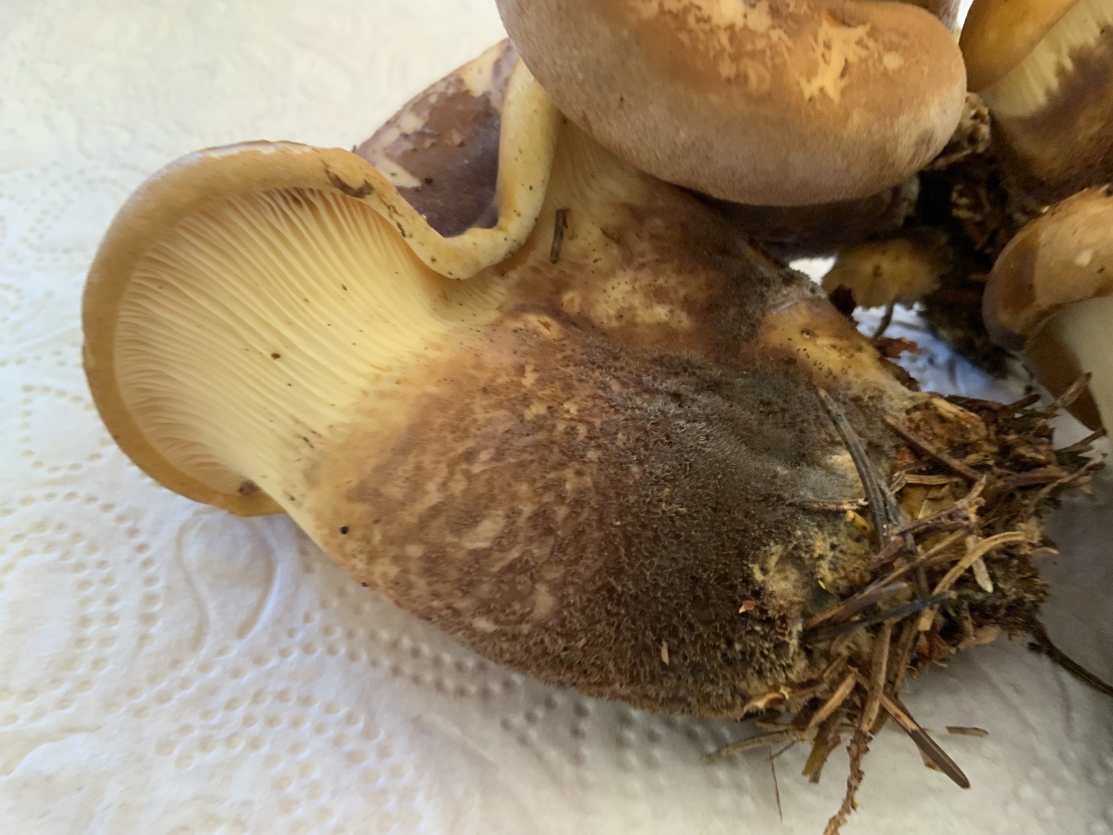 suche einen Ansatzpunkt, ob es sich hier um einen Vertreter der Stoppelpilze handelt.