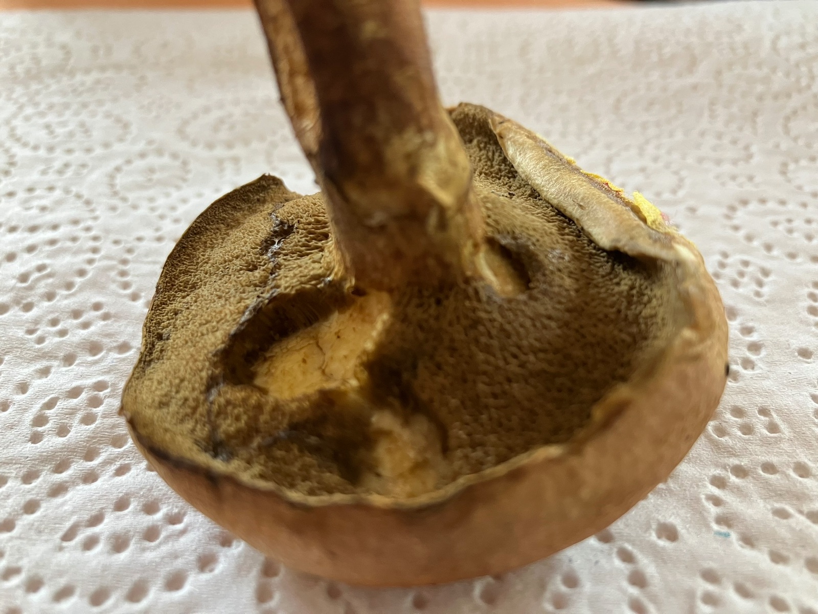 Schnell blau anlaufende Bruchstellen, Stiel an der Basis gelb, Hut ist braun, angefressene Stellen am Stiel verfärben sich rötlich.