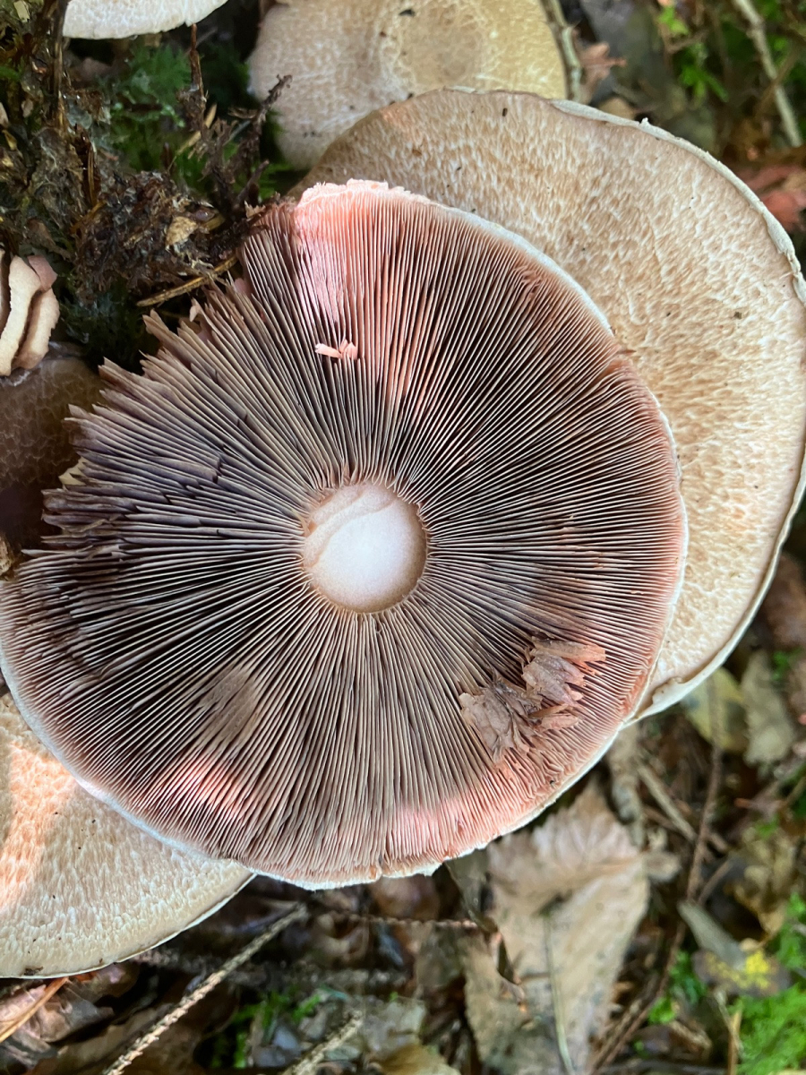 Unterseite: Lamellen, hell, gehen um den Stil herum
