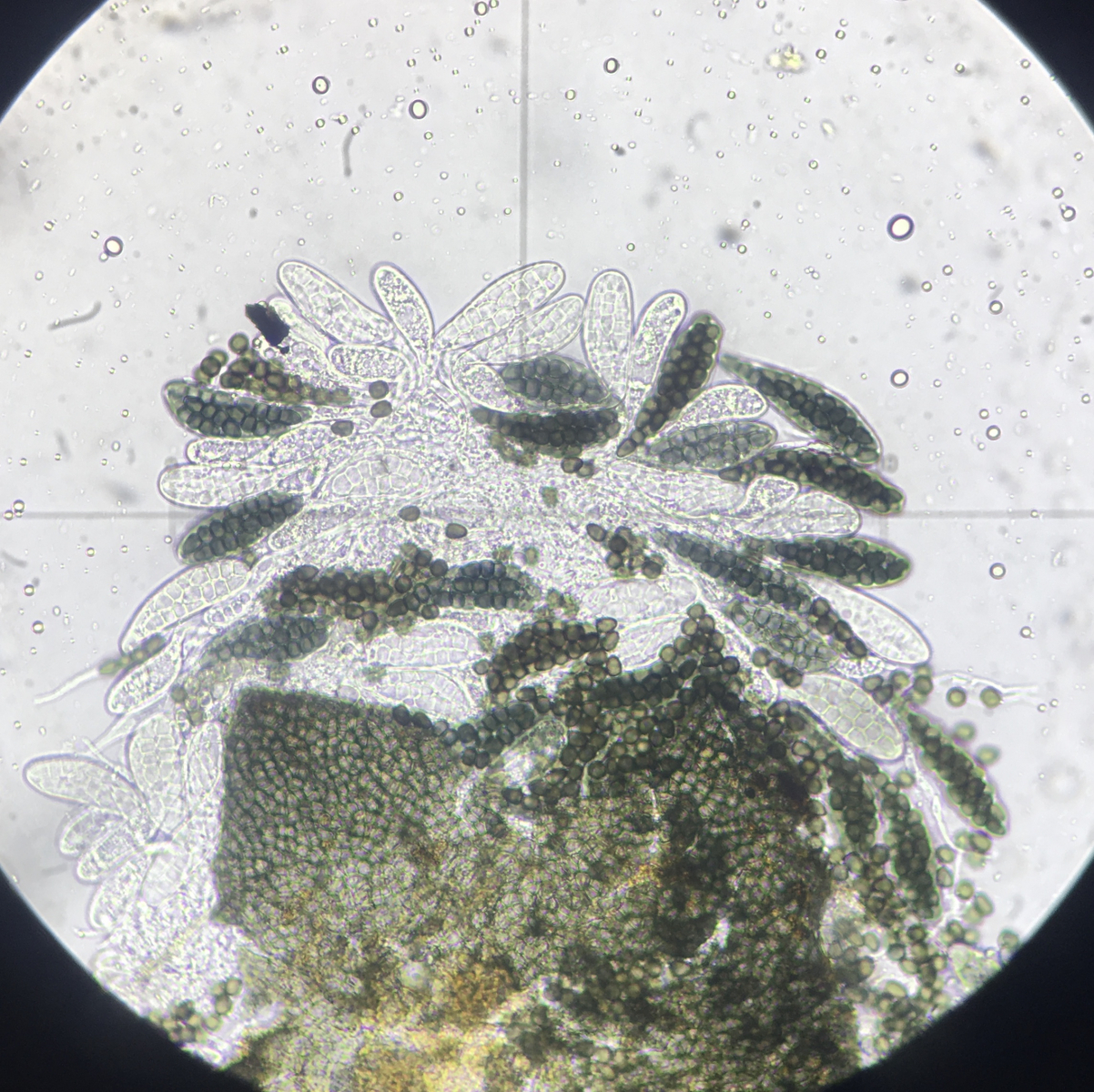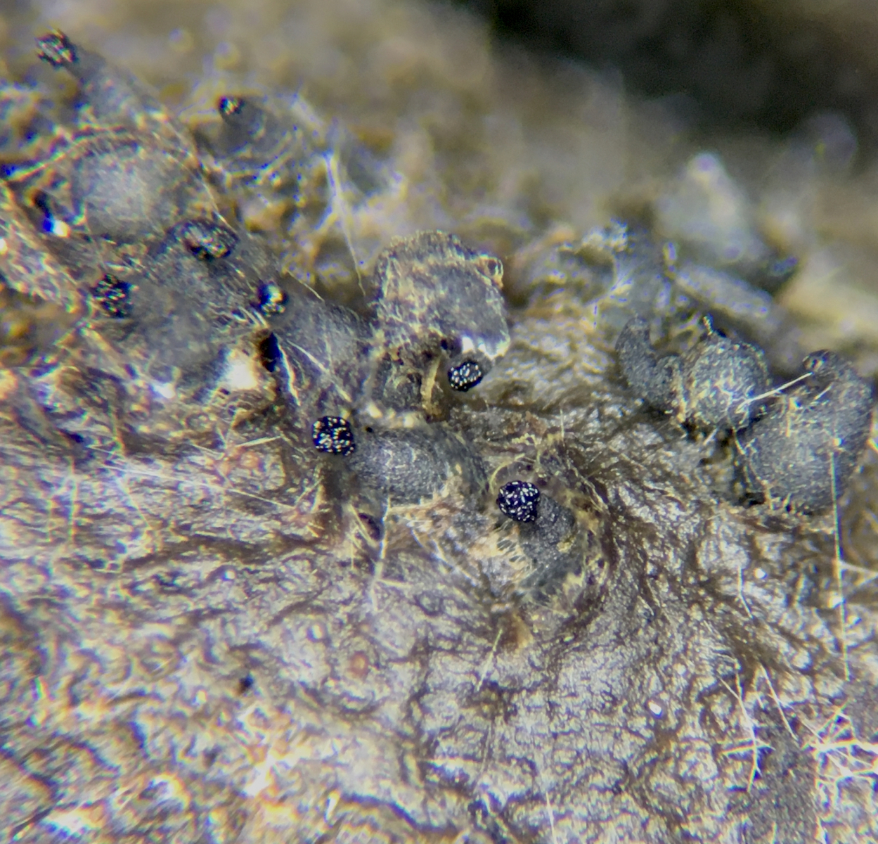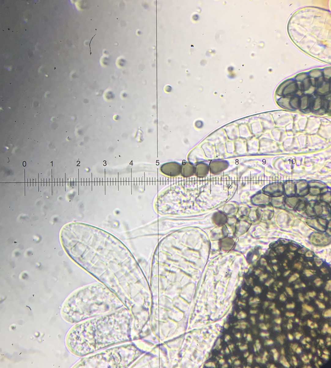 Es passt nun wirklich das meiste - Sporengröße, der Keimschlitz, daß Zellen so schnell auseinanderbrechen. Und es sieht ja auch wie weiße Haare um den Pseudothecienhals (unten noch einmal ein Bild). Das einzige was nicht passt, ist daß ich keine Haare unterm Mikroskop sehe, und ich habe es mehrfach versucht sie zu finden. Angetrocknete Asci wären da eine bessere Erklärung.