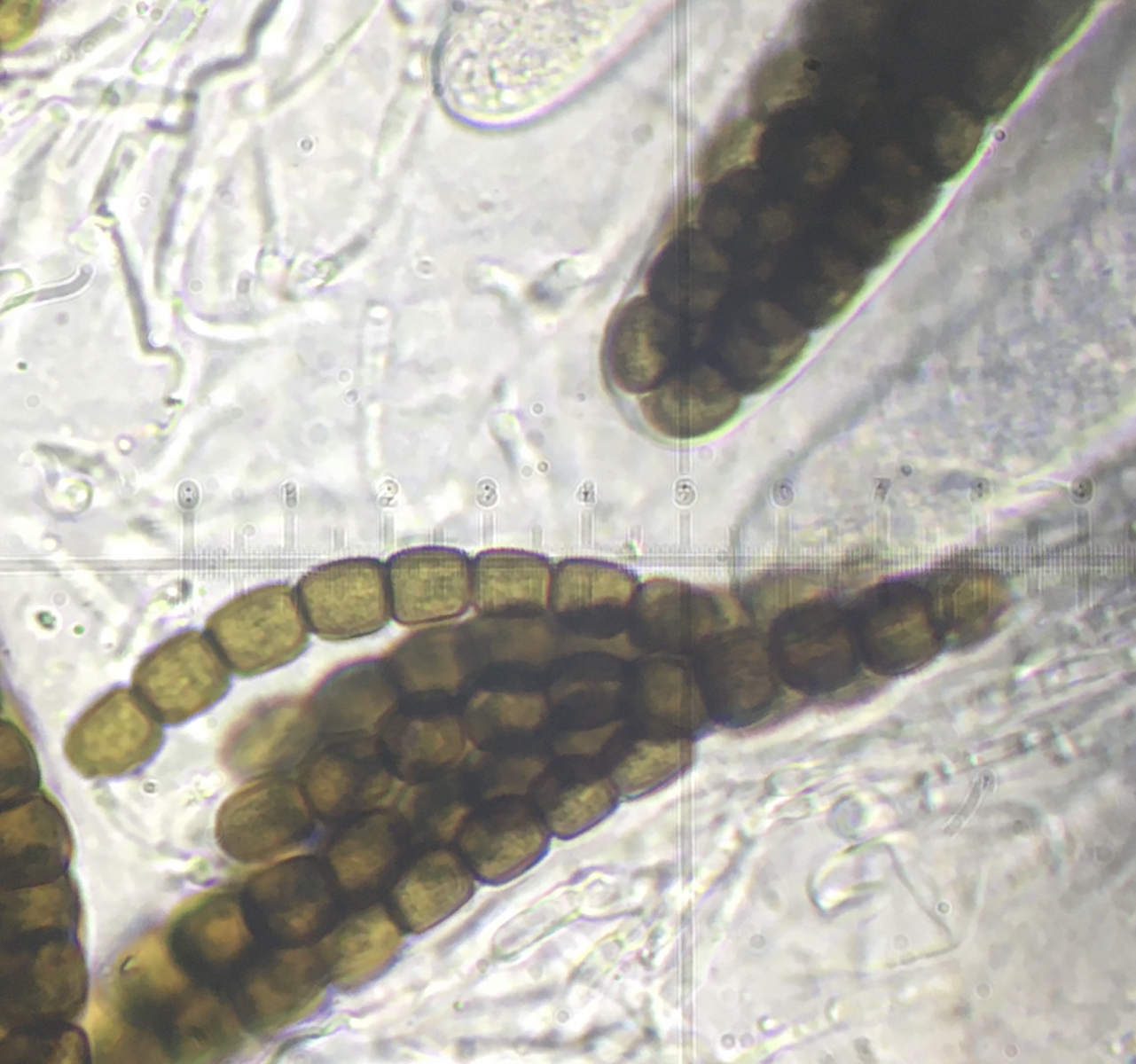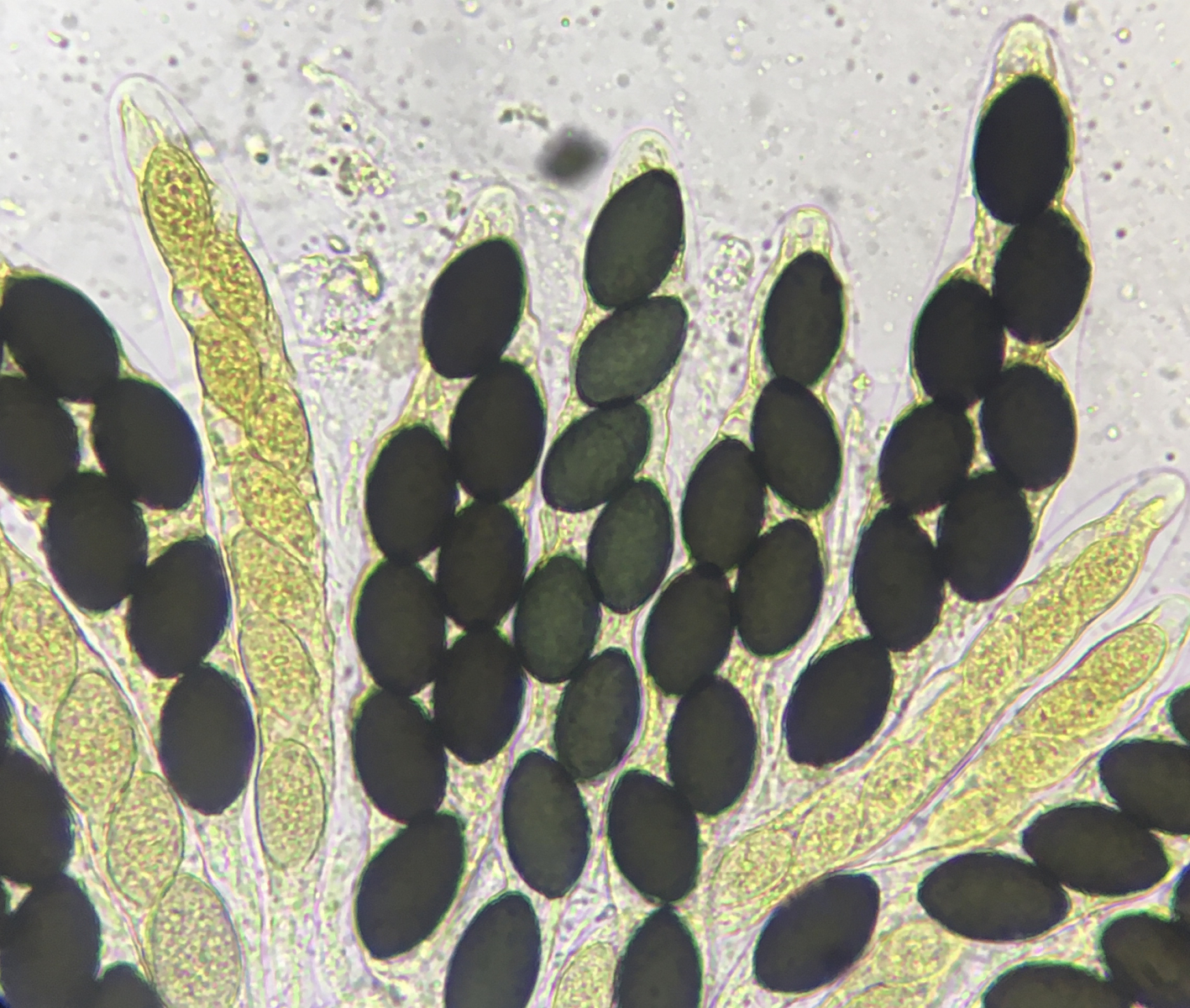 Hier wimmelt es nur von Sporormiellas. Der selbe Dung, diesmal mit einer 10-zelligen Sorte. Perithecium hat graue Haare um die Ostiole. Asci sind um die 150µm lang. Sporen sind 50-52µm x 10-12µm. Keimzellen gehen gerade runter und ich sehe sie nur an den ersten/letzten Zellen.