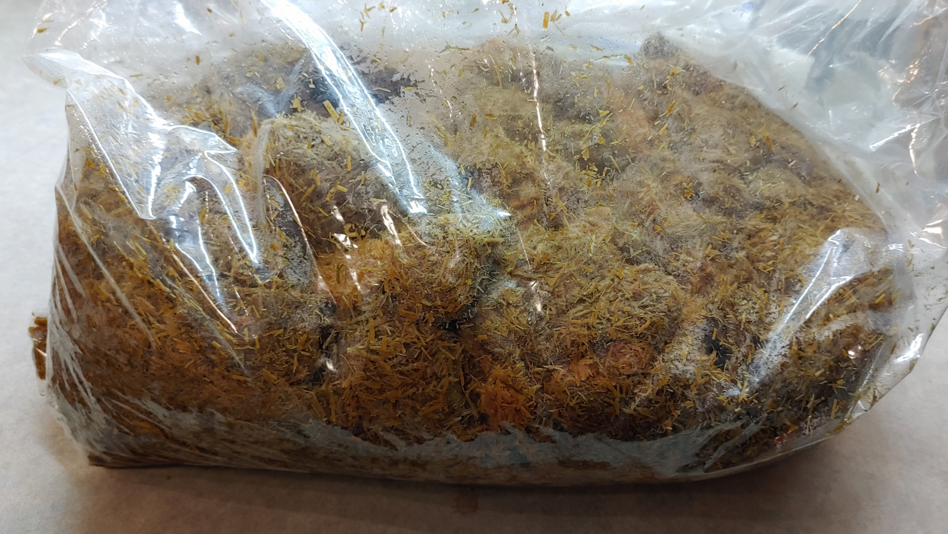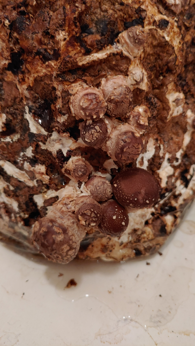 Dafür tut sich was bei den Shitakepilzen, die Pilzmännchen mir für das Einschicken der Grünspahnbecherlings-Proben geschickt hat. Die stehen bei mir im Bad bei 18 Grad und werden täglich abgeduscht.