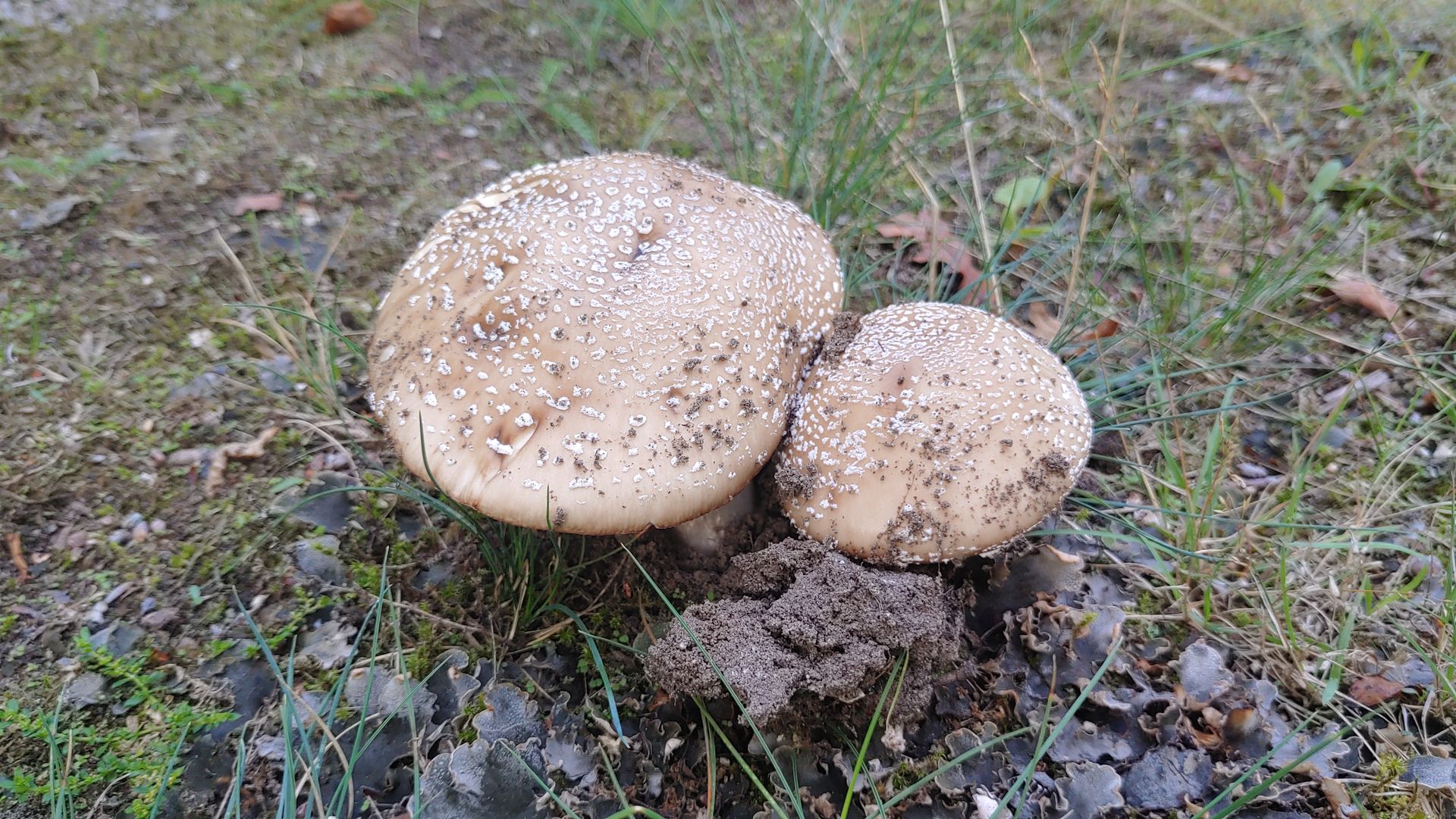 Also, ich tippe auf Pantherpilz, ansonsten Grauer Wulstling oder was mit dem rosa Ton einhergehen würde, Perlpilz.