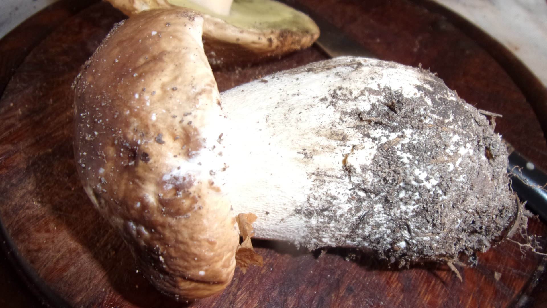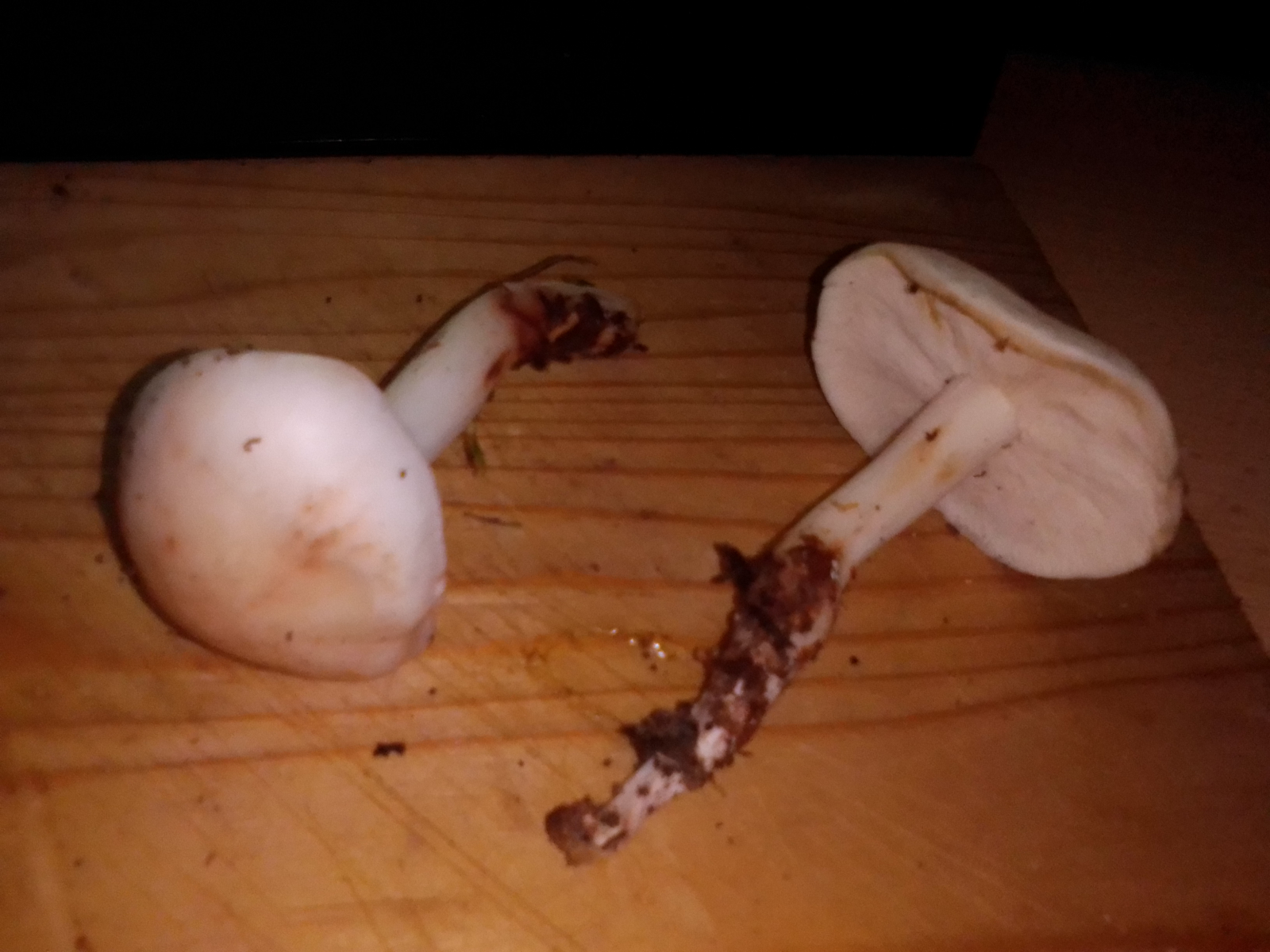 Ich zeige hier mal ein paar Bilder. Der eine Pilz hat oben auf dem Hut ebenfalls weiße Stellen.