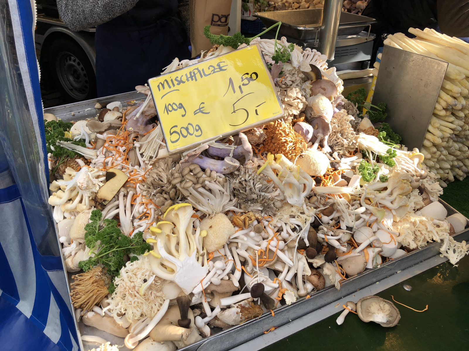 Ich war heute in Münster auf dem Wochenmarkt und war begeistert, welche Vielfalt an Pilzen dort angeboten wurde.