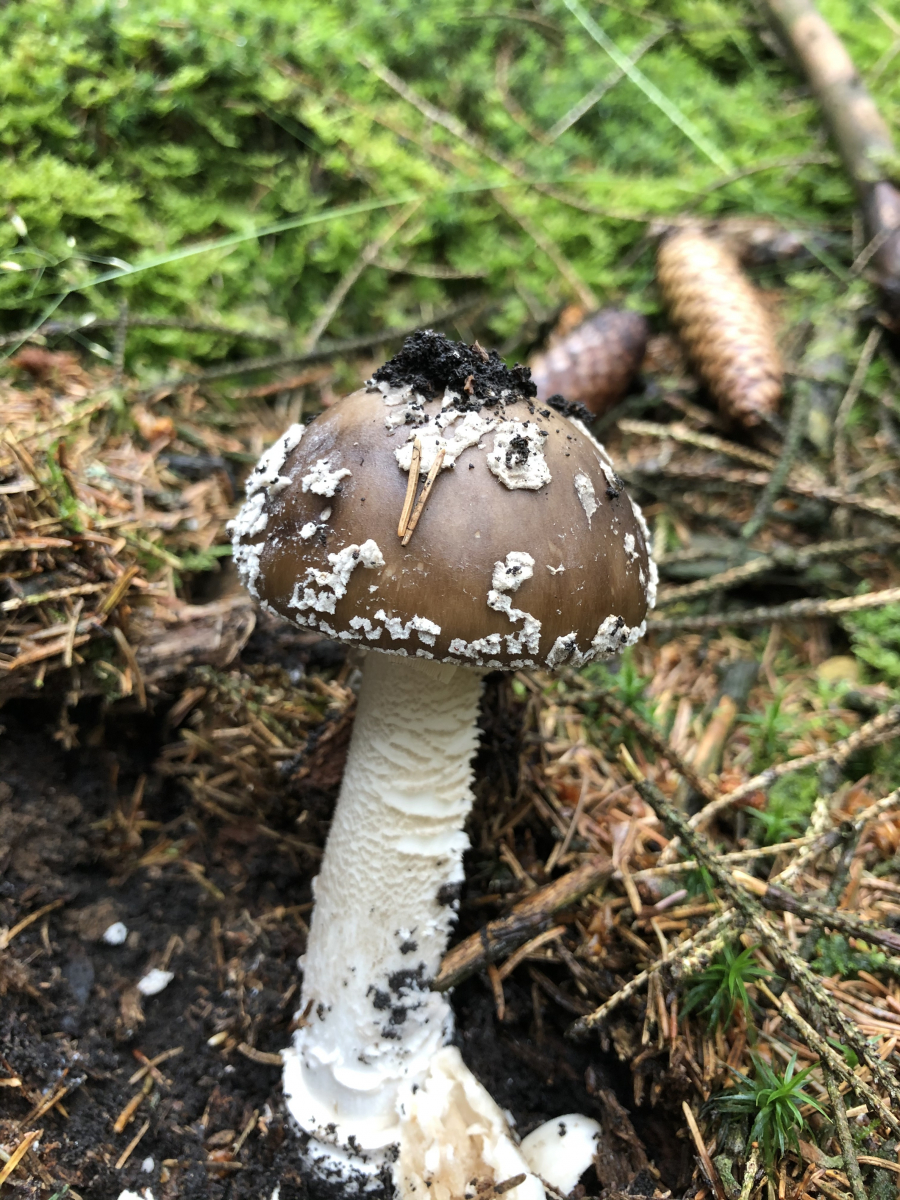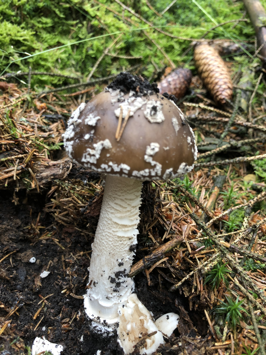 Er hat meines Erachtens nach ein „Bergsteigersöckchen“ an der Knolle. Auch alles andere sieht für mich nach Pantherpilz aus. Allerdings hatte er eine geriefte Manschette. Leider konnte ich die Manschette nicht fotographieren. Neben diesem Pilz stand noch ein zweiter kleinerer, bei dem die Manschette wenigstens einigermaßen als gerieft zu erkennen ist.