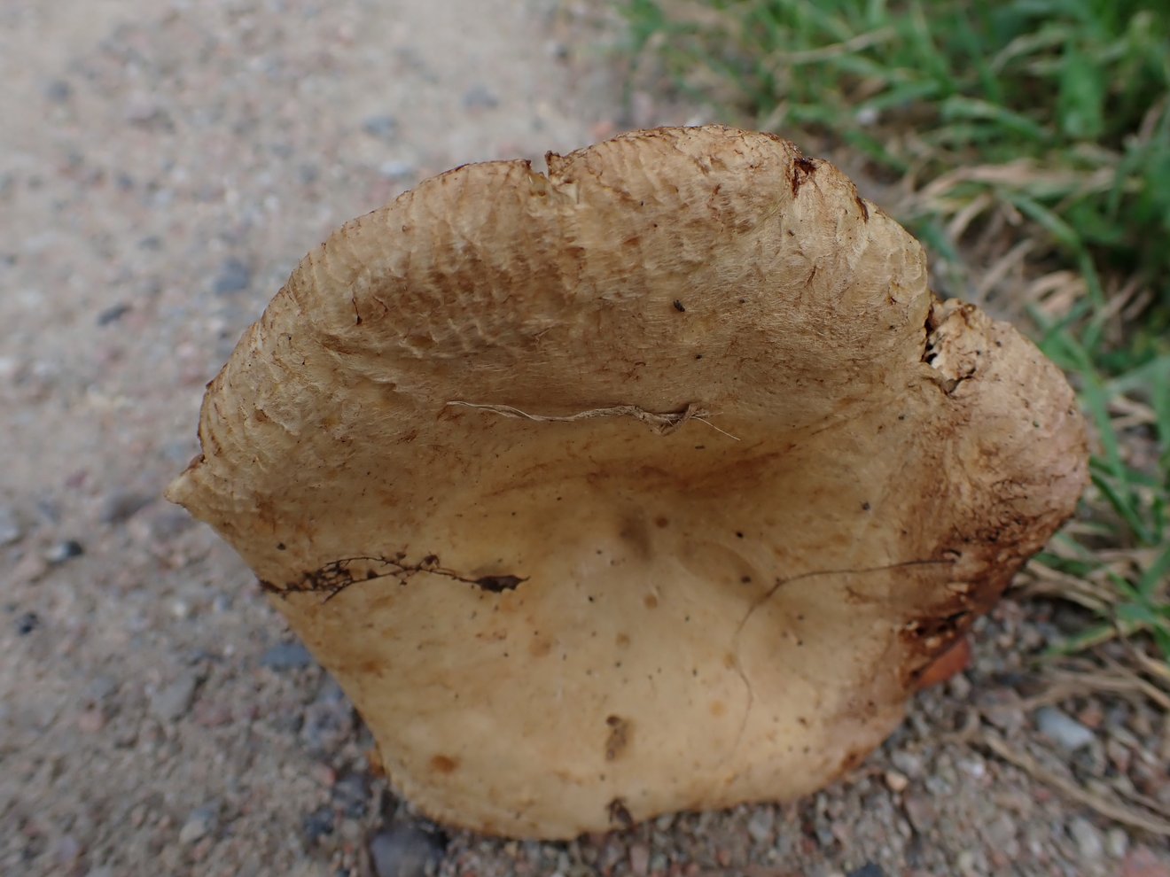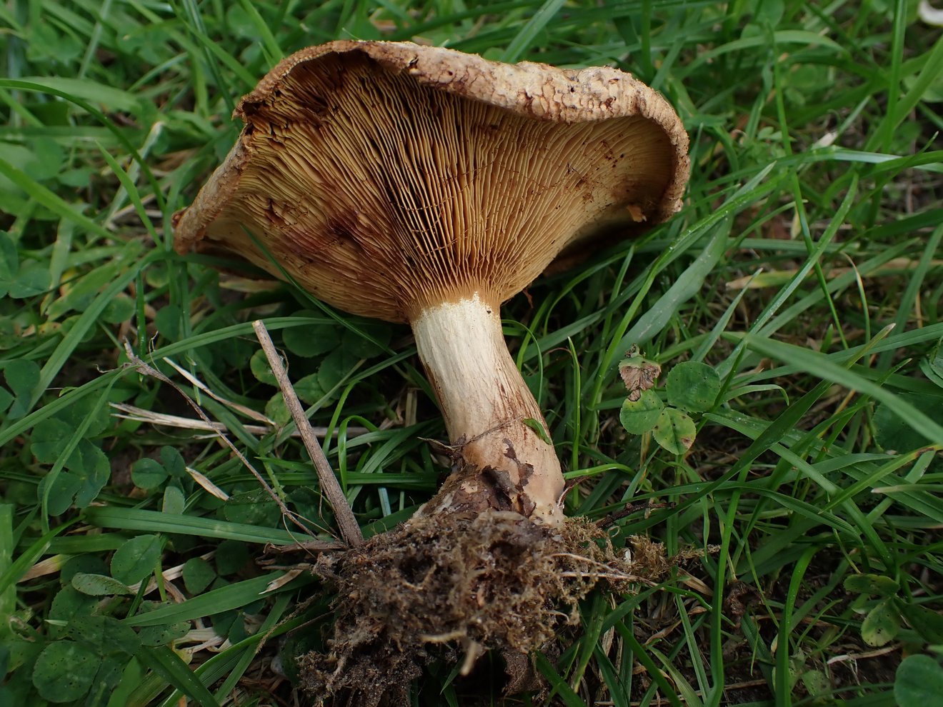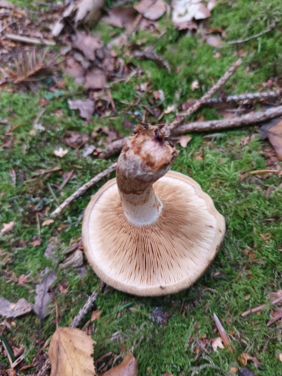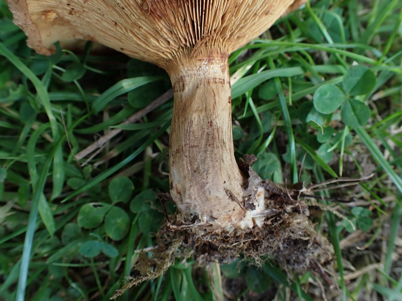 Leider ist die Stielbasis nicht vorhanden, habe sie nicht vollständig aus den Boden gelöst. Ob der Pilz eine kleine Knolle hat, kann ich also nicht mehr sagen.