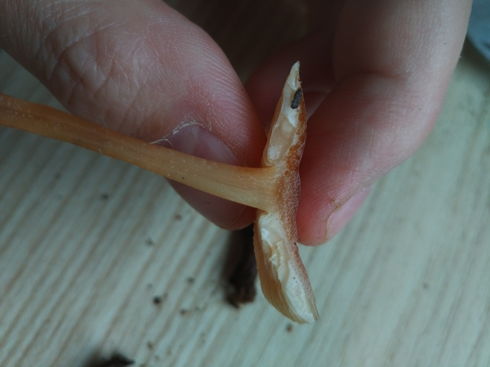 Lamellen mit leichtem Gelbstich und auf mich fast frei, wenn nicht ausgebuchtet angewachsen wirkend.