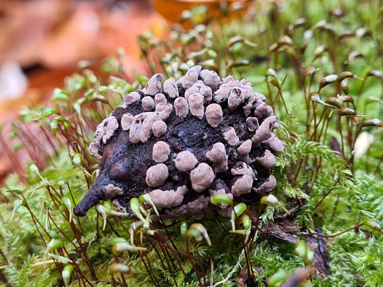 Vor ein paar Tagen fand ich diese Buchenfruchtschale, die mit etwas überzogen war. Es schien, als würde dieses Etwas die feinen Häärchen an der Außenseite "zersetzen". Fluffige, aber doch erstaunlich feste Konsistenz, beim rumprokeln löst man das Häärchen mit ab. Ist es ein Schimmel- oder Schleimpilz?
