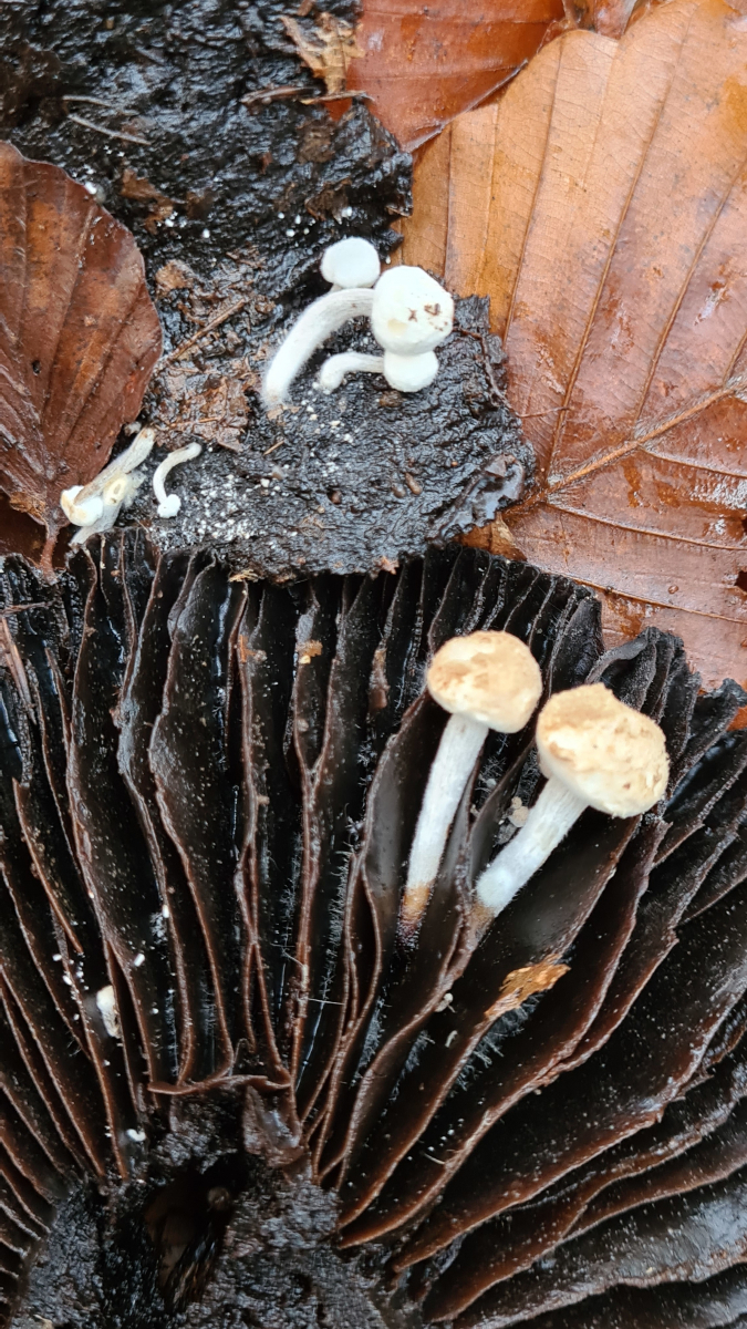 ...ich hab gestern im Süntel mal wieder parasitierende Pilze auf einem alten Schwärztäublings-FK gemacht. Da es ja nur zwei Arten gibt, die auf Täublingen und Milchlingen parasitieren, bin ich mir relativ sicher, dass es sich um den stäubenden Zwitterling - Asterophora lycoperoides handeln müsste.