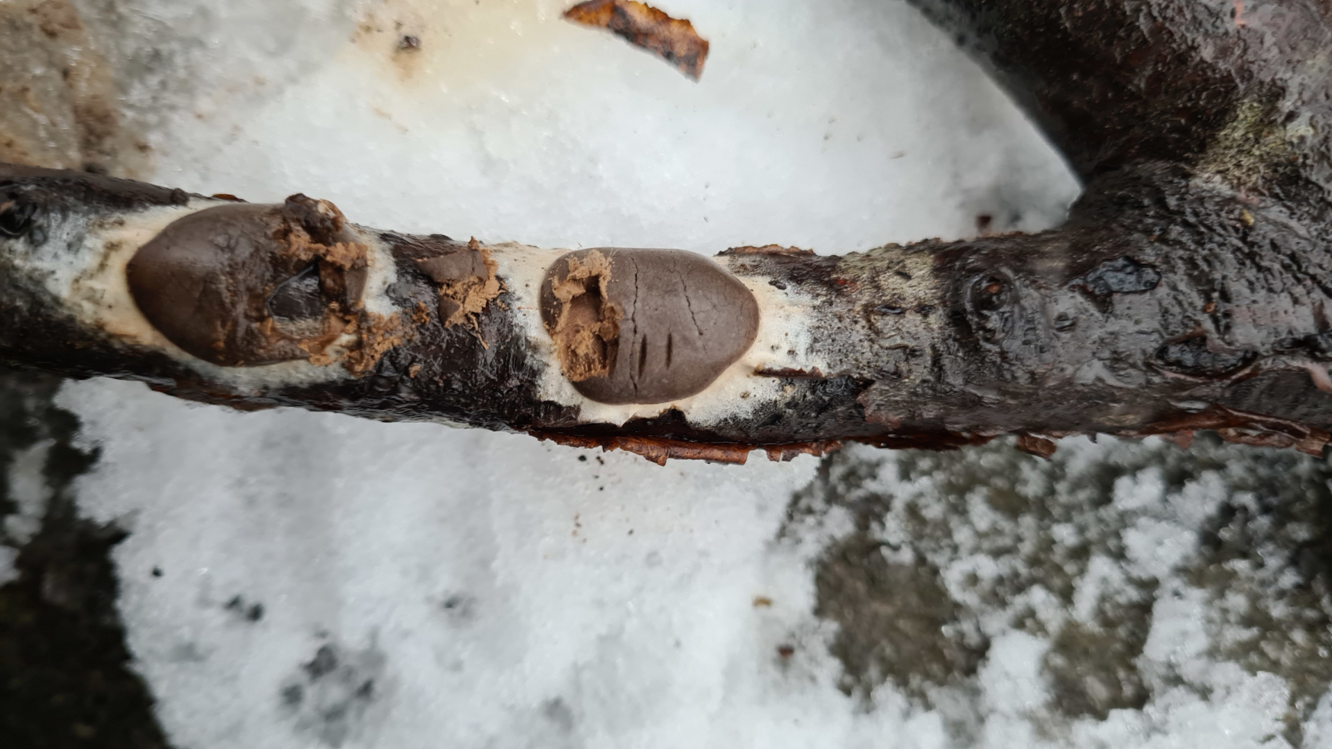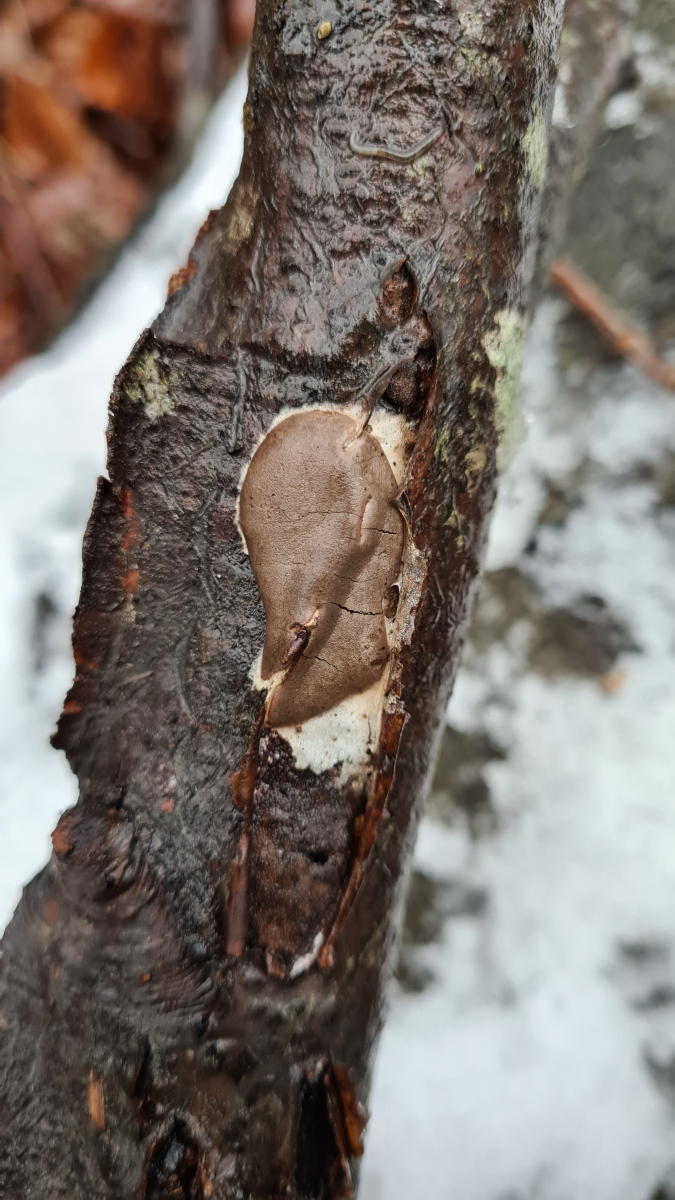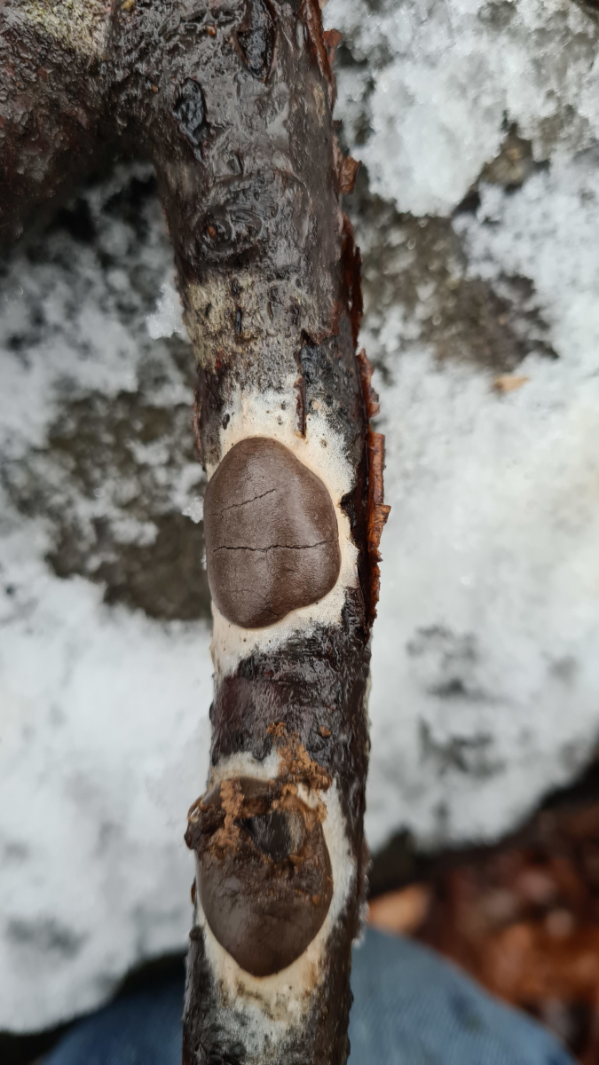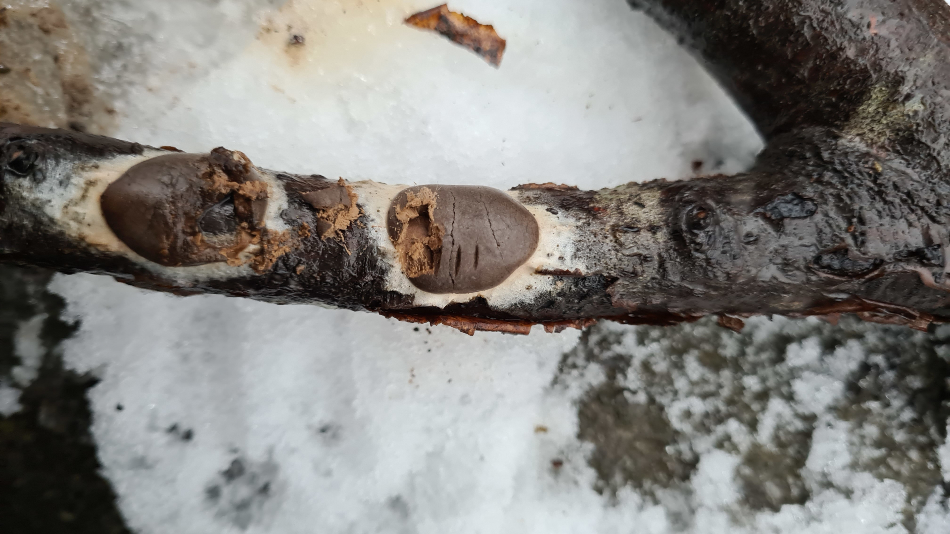 ...ich habe heute im Süntel am Waldrand auf einem Totholzast etwas gefunden, was ich für einen Schleimpilz halte. Er war schon älter, die Konsistenz war pastenartig, bröckelig. Es waren insgesamt 5 "Placken" von circa 1,5-2cm Durchmesser, sowohl auf der Astoberseite als auch auf der Unterseite. Farbe war gräulich, braun und die Oberfläche wies wenige, feine Risse auf. Rund um die Placken waren waren weissliche Fadenartige Strukturen sichtbar.