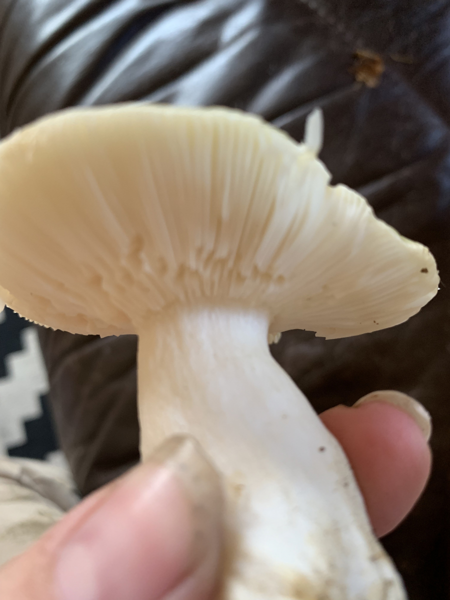Die Lamellen sind jung weiß, alter blassrosa, Hutrand ist flatterig