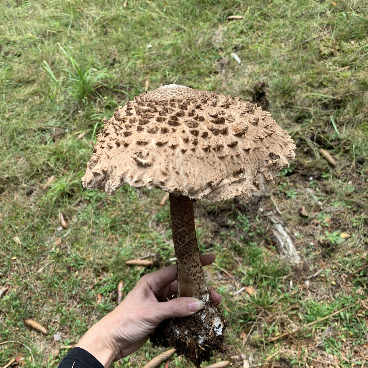 Stiel schuppend, dunkelbraun, beige, weiß.Ich würde zu Parasol tendieren - aber dieser ist so dunkel - von den Bildern eher ein Habicht - aber wird der so riesig?
