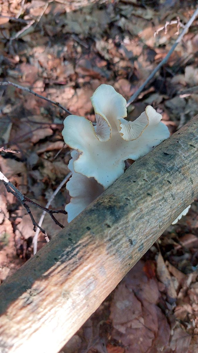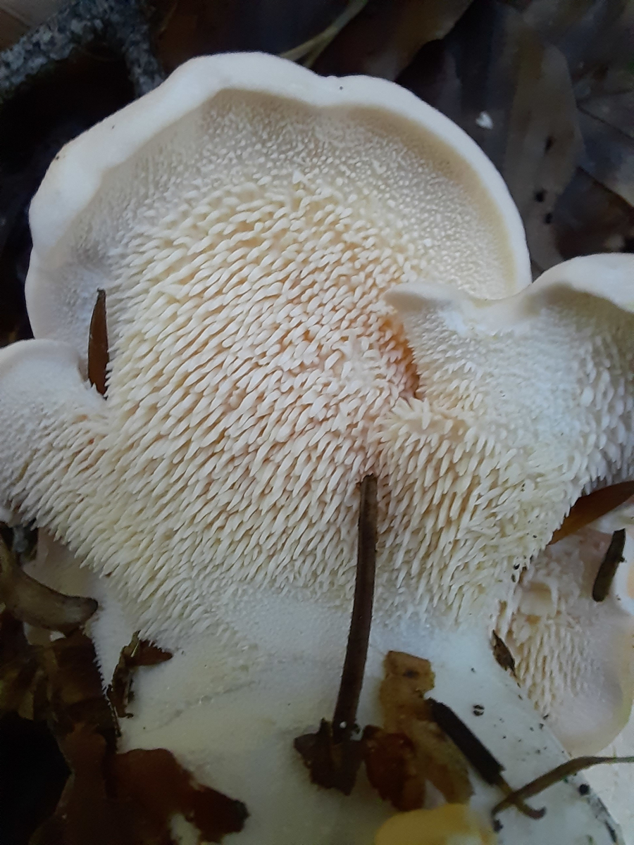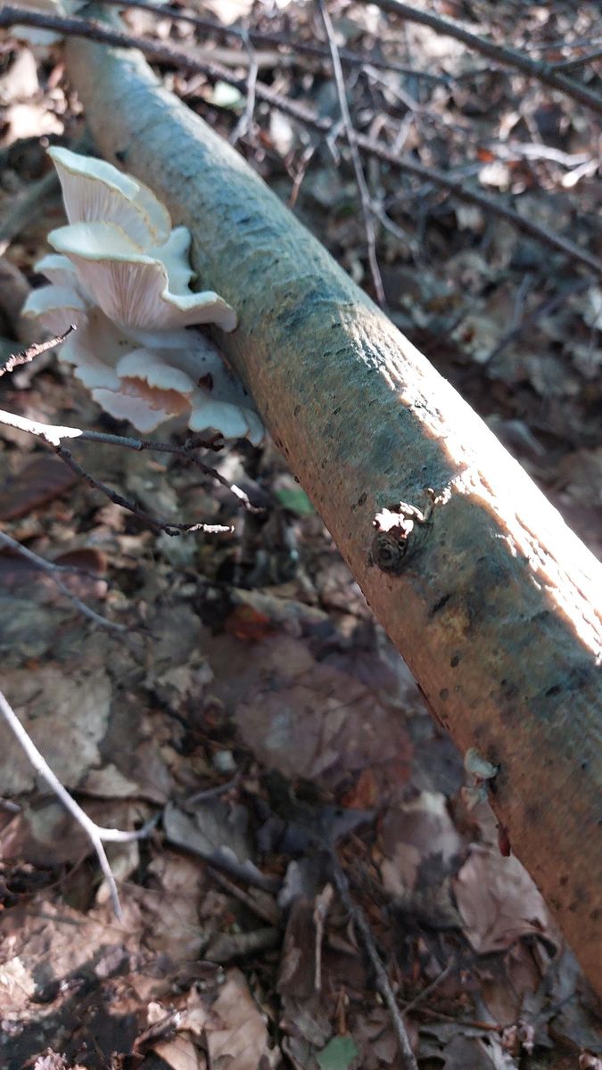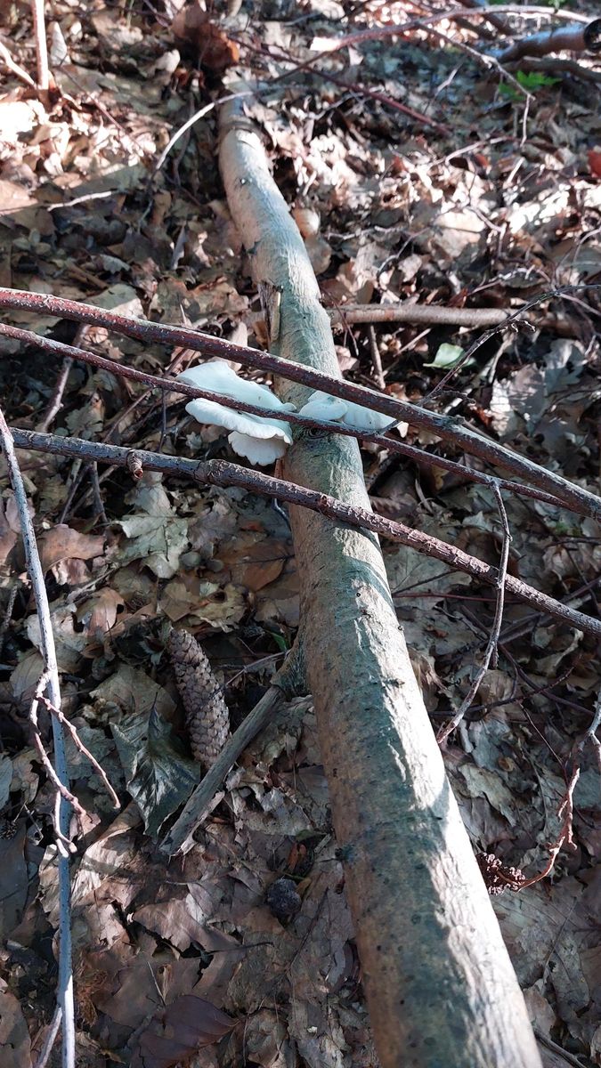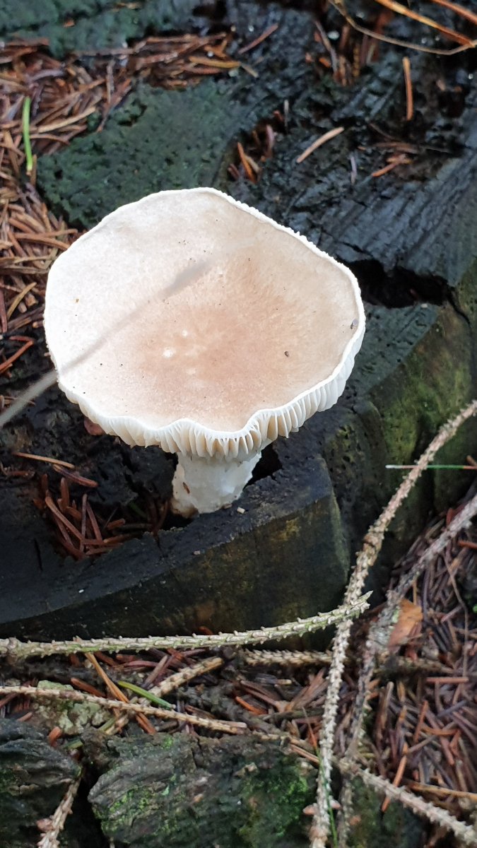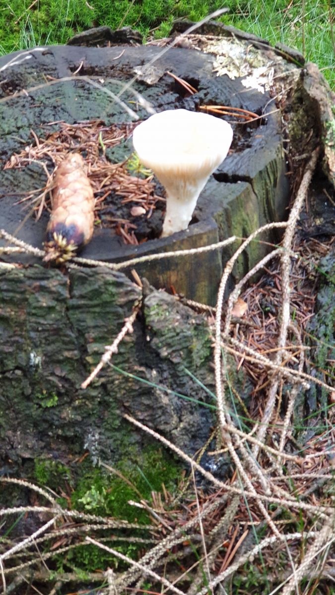 Aber auf einem Baumstumpf sahen wir auch einen weißen Pilz, fester Hut, fester Stiel, wuchs in einem Loch auf einem Baumstumpf. Die Basis konnte ich nicht sehen. Ich wollte ihn stehen lassen. Der sah dort richtig hübsch aus.