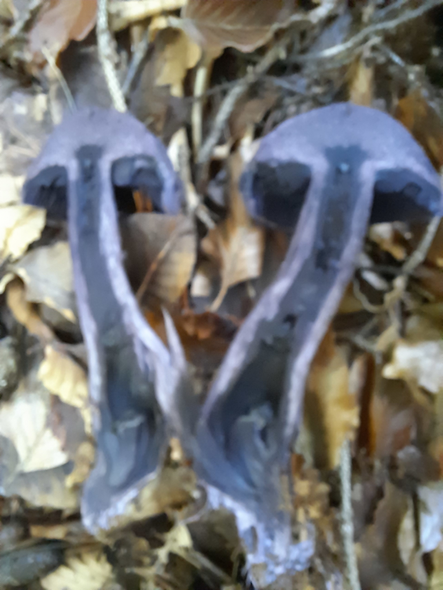 Er stand in einer Gruppe Gleichartiger und ca. 3m von einer Gruppe Nebelkappen entfernt am Wegesrand. Der Weg fürhrte durche einen Laubwald, meist Rotbuchen und ein paar wenige Eichen. Es gab größere und kleinere Exemplare in dieser Gruppe er war mittelgroß. Länge Fuß bis Hutoberkante ca. 15cm Hutdurchmesser ca. 6 cm. Stieldurchmesser oben direkt unterm Hut ca. 2 cm und unten am Fuß ca 3 cm. Erfühlt sich durchgängig fest an.
