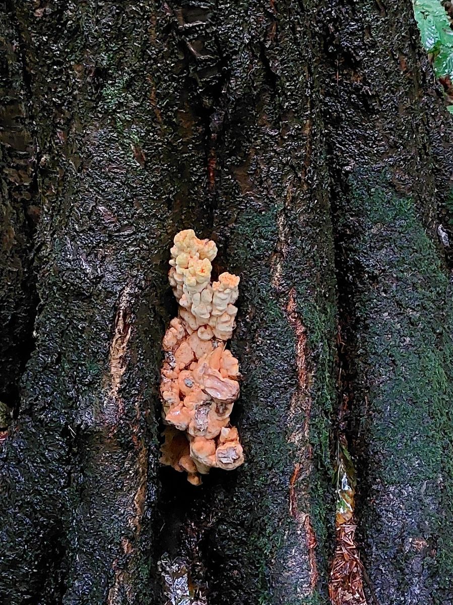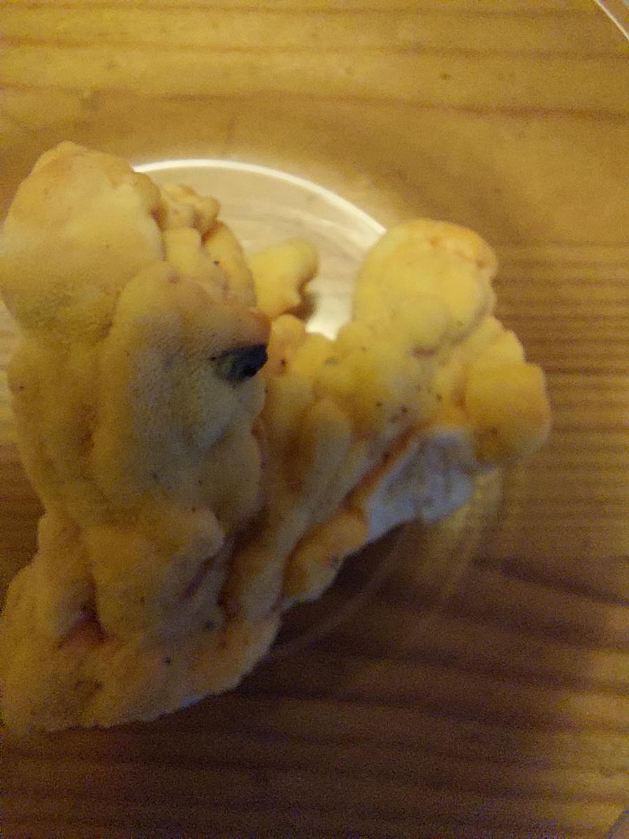 Er war in eine "Baumfalte" eingequetscht (siehe Fotos) und ich vermute Schwefelporling, bin aber sehr unsicher.