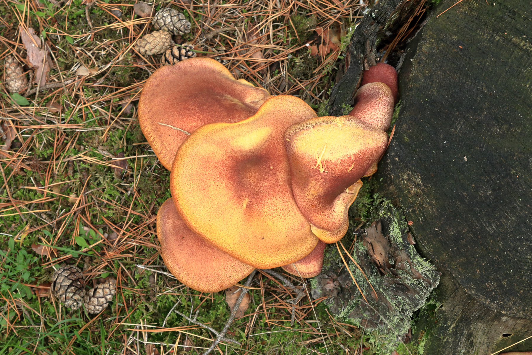 Diesen hier fand ich auffallend, da er regelrecht aus der Baumrinde des Baumstumpfs hervormarschiert.
