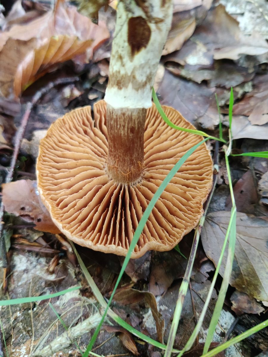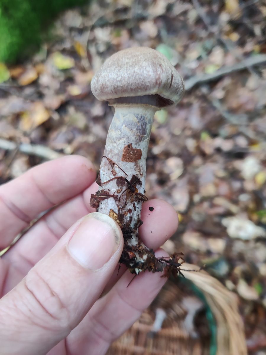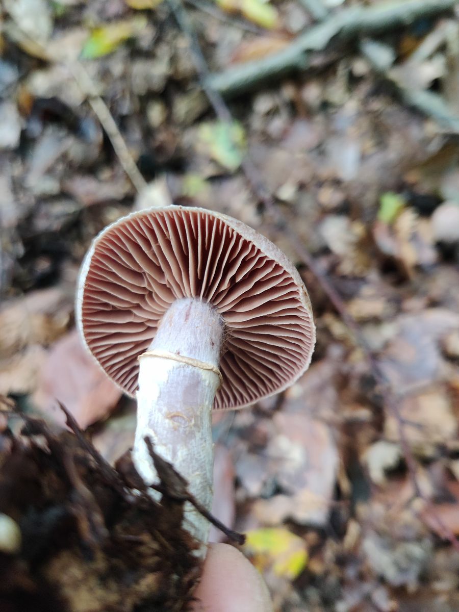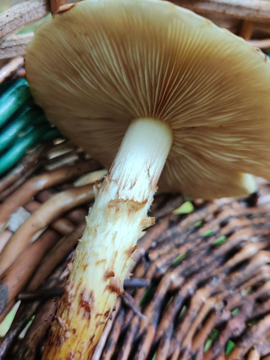 Die Lamellen erscheinen bräunlich. Er ist festfleischig, der Stiel hat einen Ring im oberen Drittel, vermutlich vergänglich. Der Geruch ist unauffällig, aber darin bin ich nicht sonderlich gut.