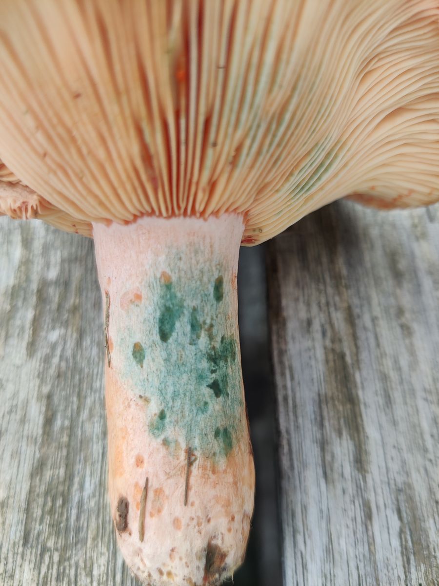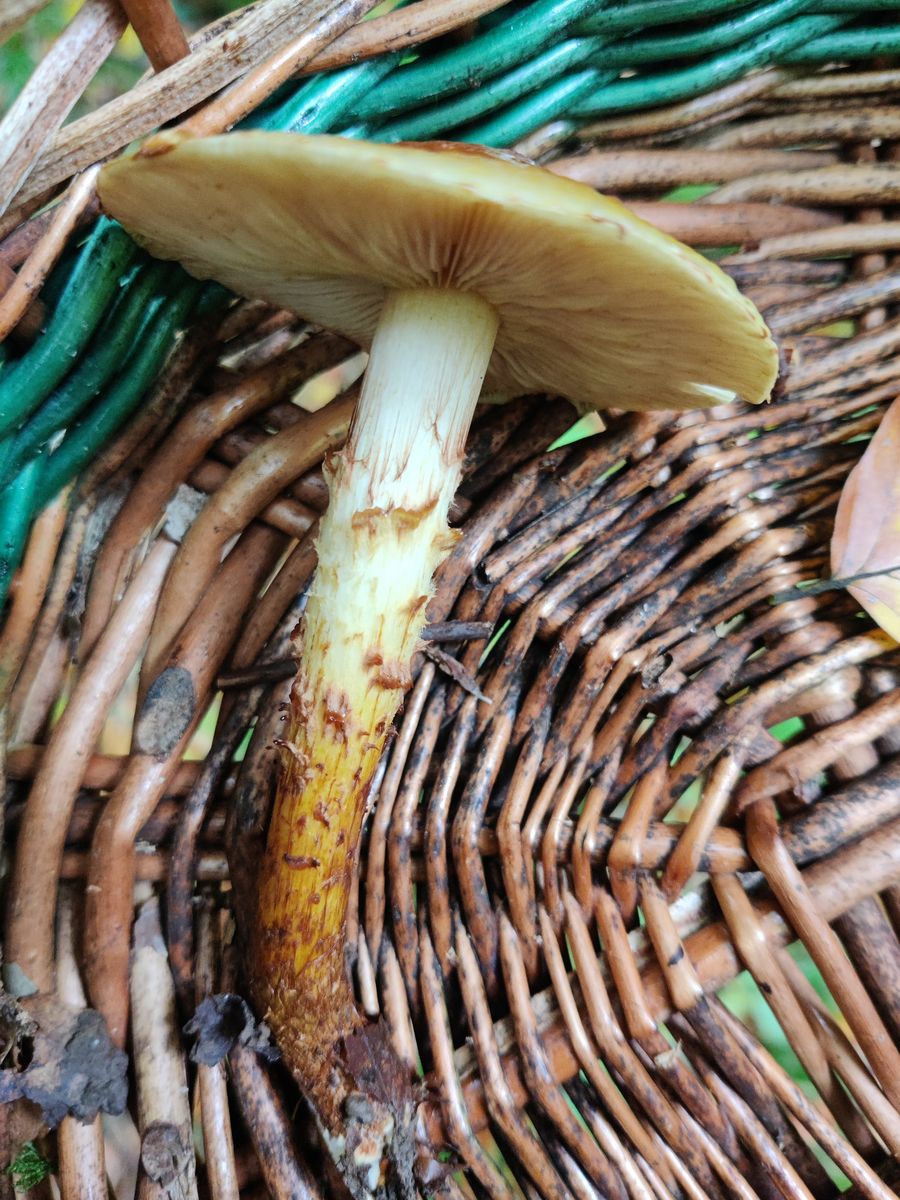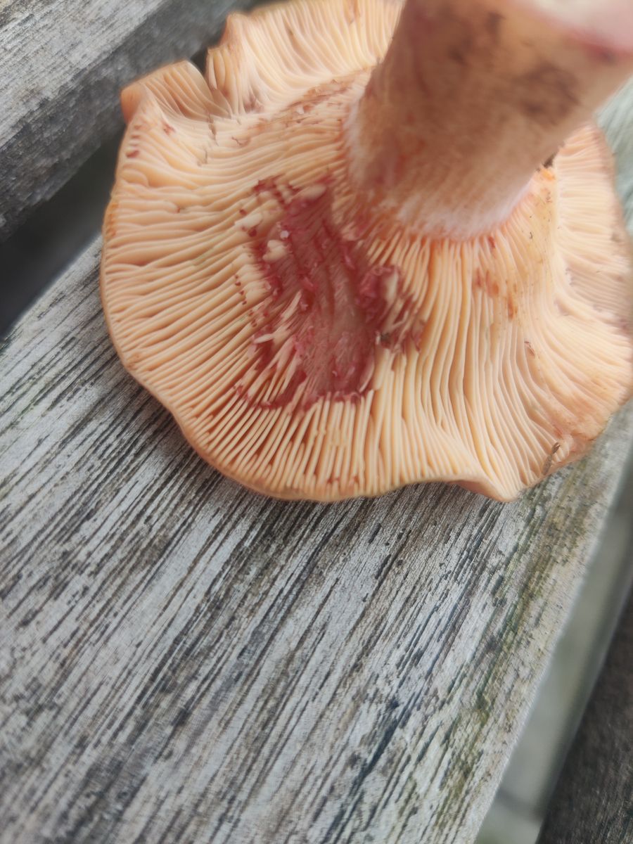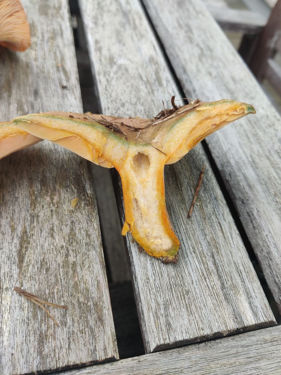 Die Lamellen erscheinen bräunlich. Er ist festfleischig, der Stiel hat einen Ring im oberen Drittel, vermutlich vergänglich. Der Geruch ist unauffällig, aber darin bin ich nicht sonderlich gut.