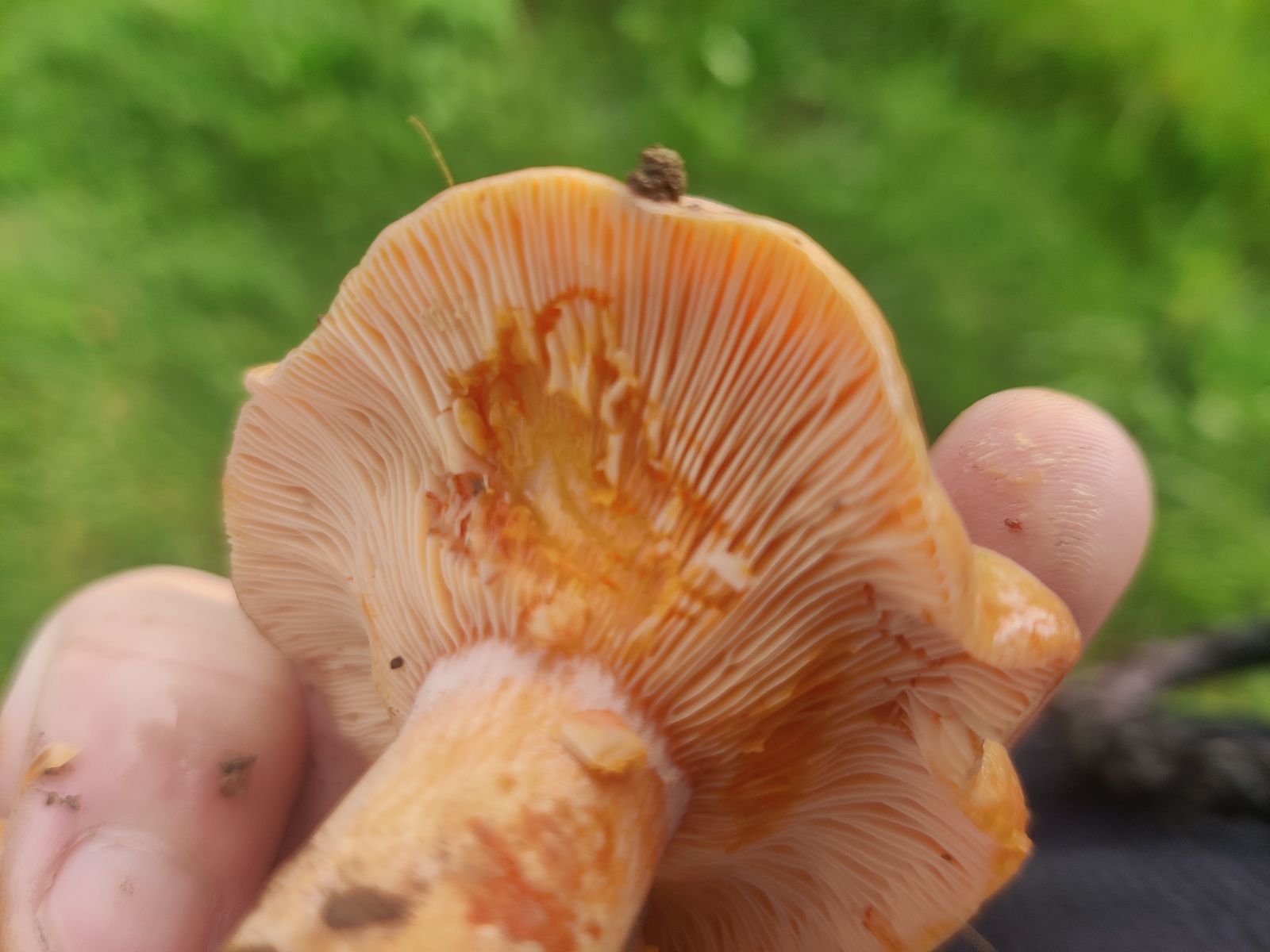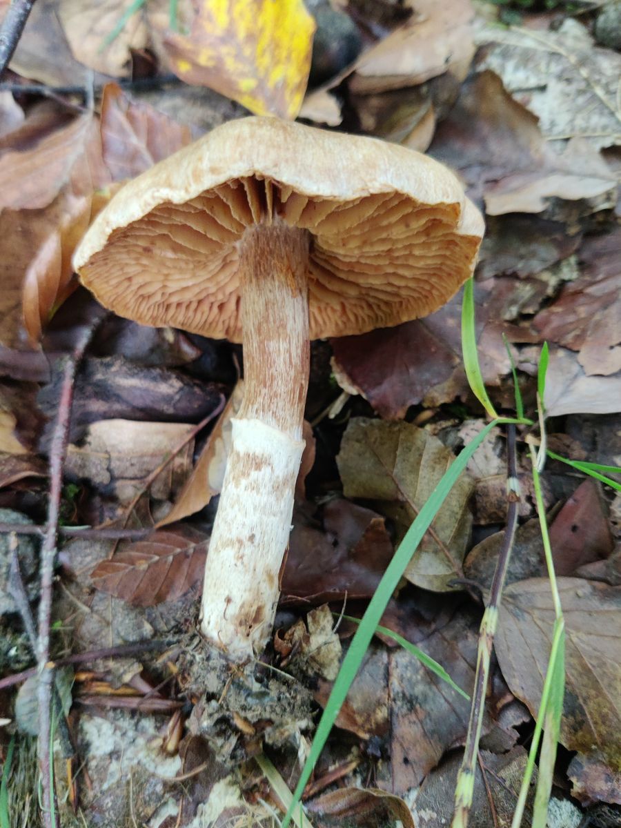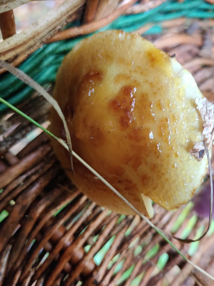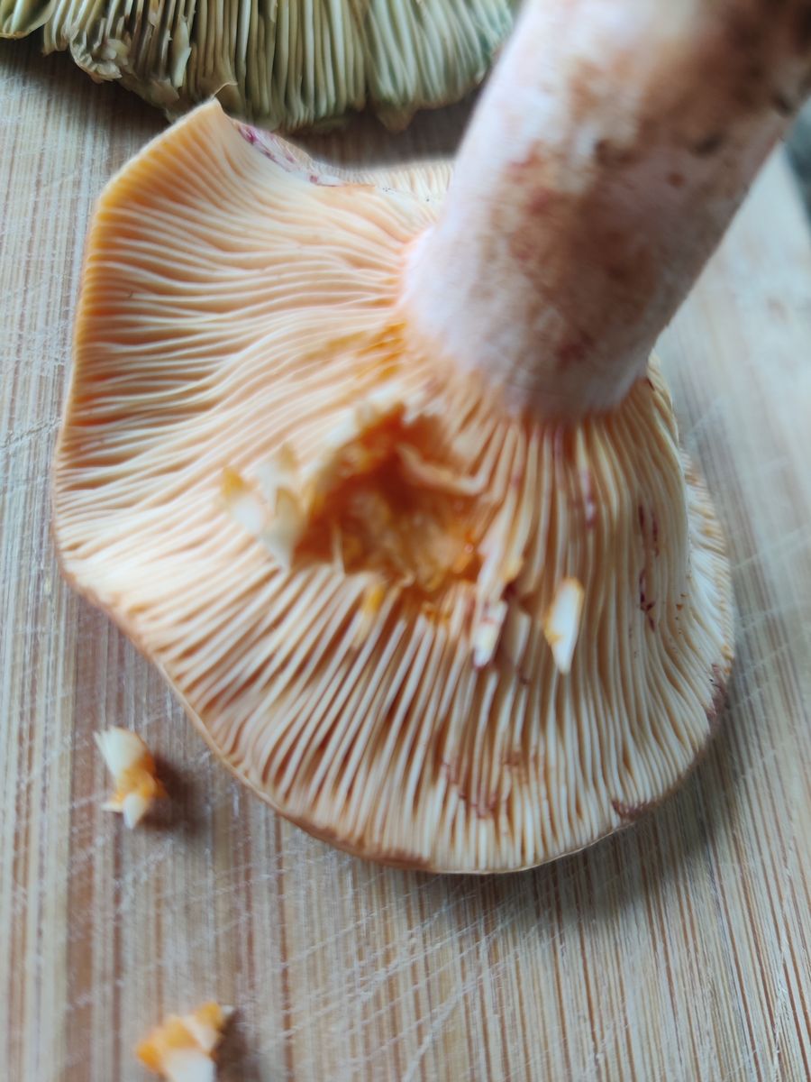 Die Lamellen erscheinen bräunlich. Er ist festfleischig, der Stiel hat einen Ring im oberen Drittel, vermutlich vergänglich. Der Geruch ist unauffällig, aber darin bin ich nicht sonderlich gut.
