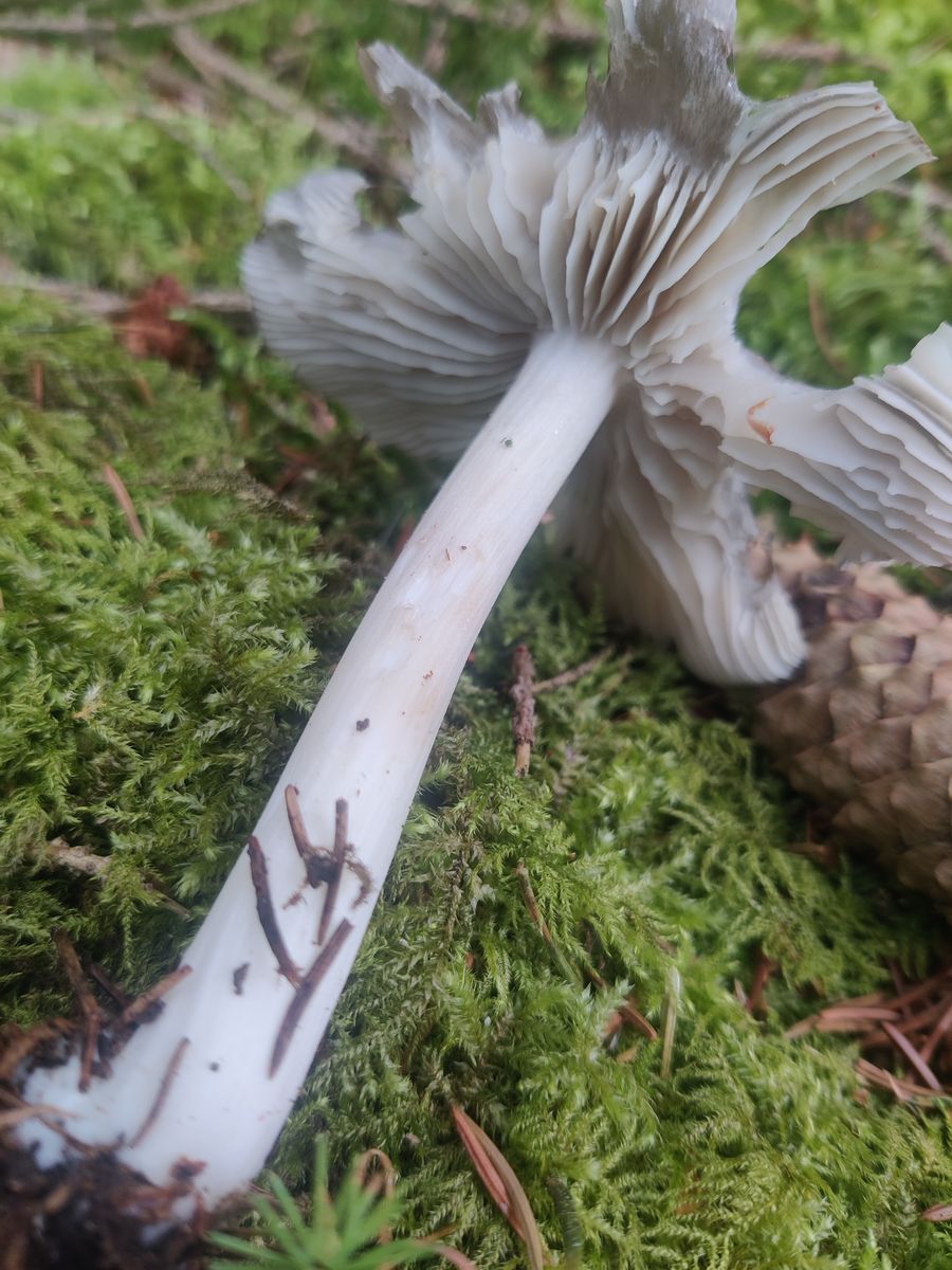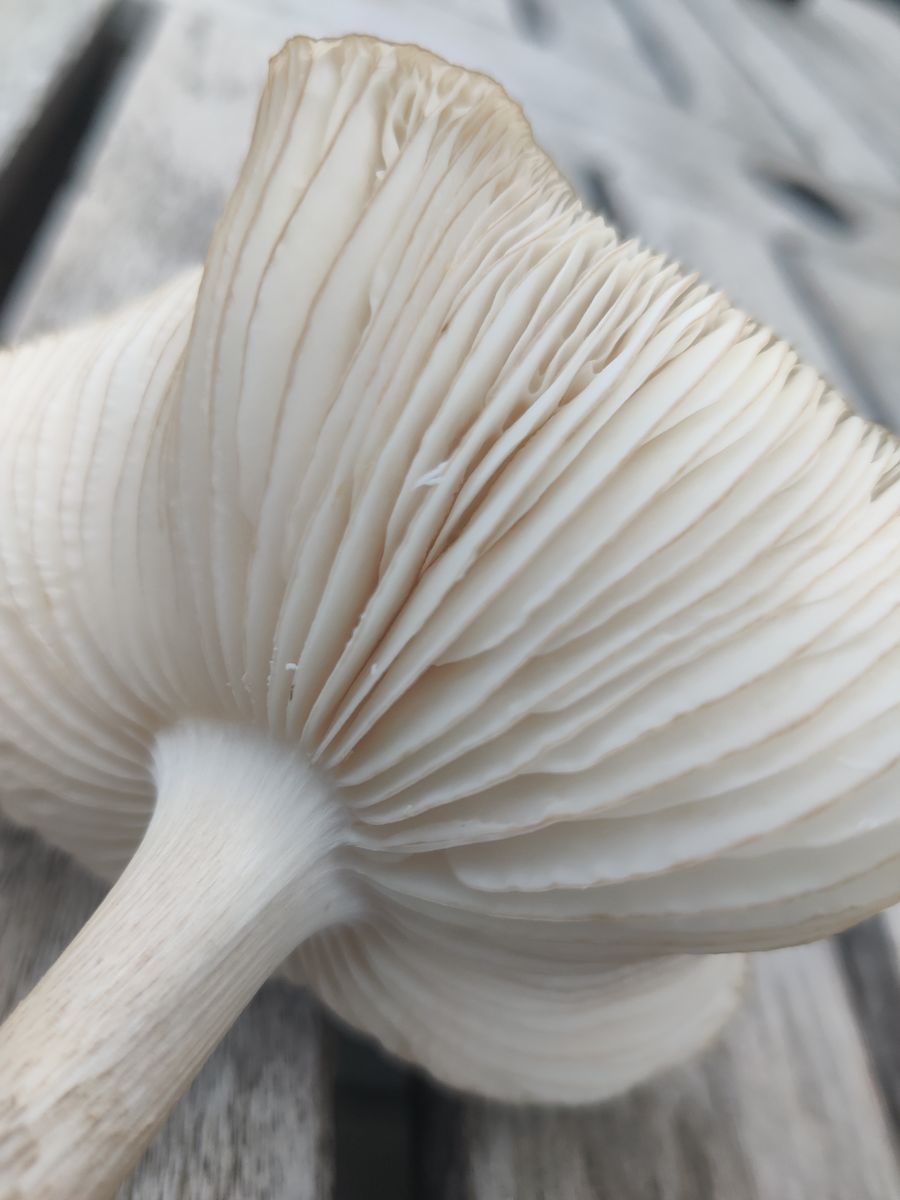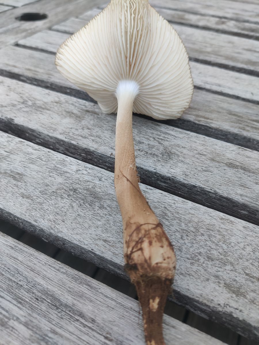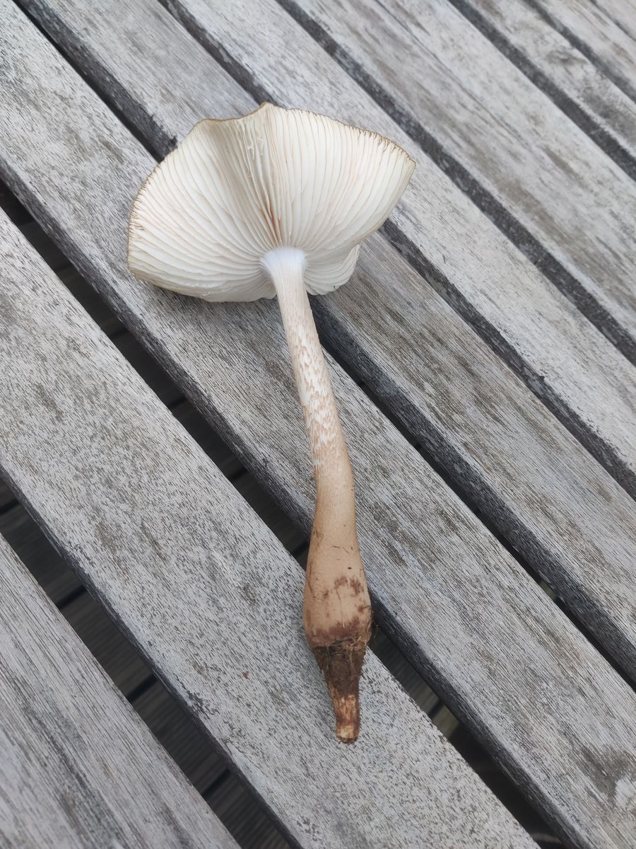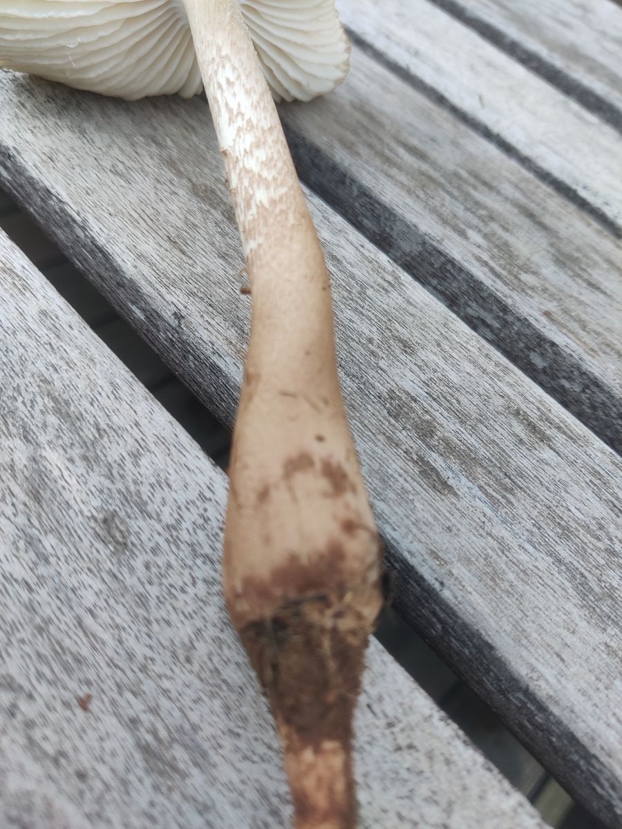 Der andere erschien weiß, ich gehe von sehr jungen Exemplaren aus. Der Stiel ist weiß, an der Basis zur geschlossenen Knolle verdickt. Zudem mit Flocken bis zum vergänglichen Stielring. Lamellen reinweiß.