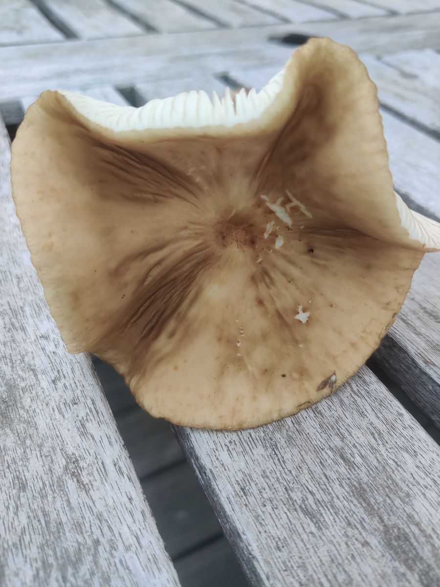 Der Hut in der Mitte Braun, dann weiß und leicht geflickt. Der Geruch ist angenehm pilzartig, keineswegs abstoßend.