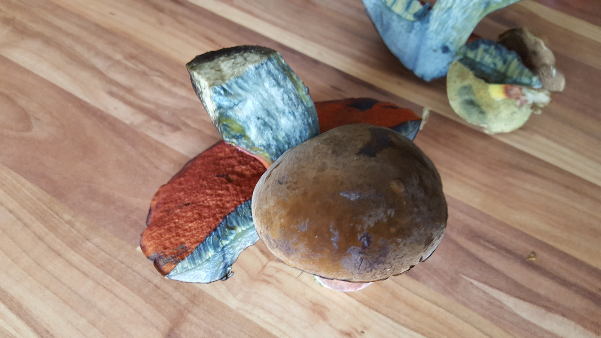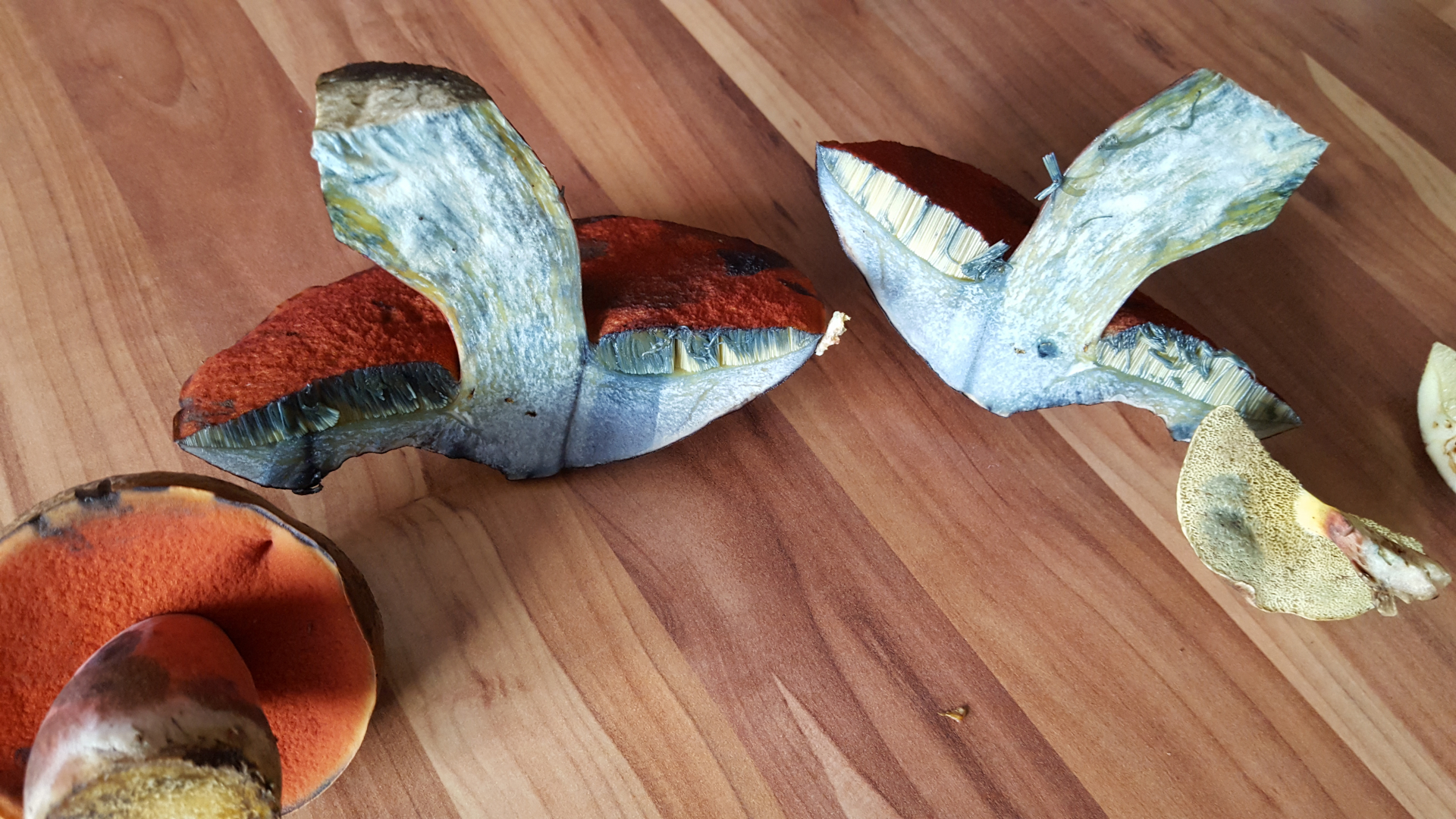 zu den beiden, find ich öfter, meist in guter qualität, was drauf schließen läßt, dass ihn die schnecken und würmer nicht so dolle finden, da weiß ich auch den namen nicht, sind schön fest, beim anschnitt sofort richtig blau, ganz feiner schwamm, und richtig ziegelrot, da sah ich welche, gut tellergroß, und außer dem dann etwas schwammigeren gefühl, immer noch wurmfrei,