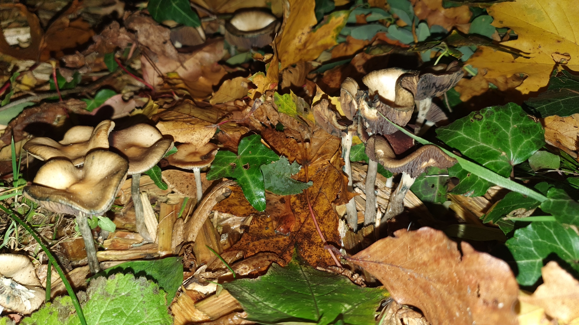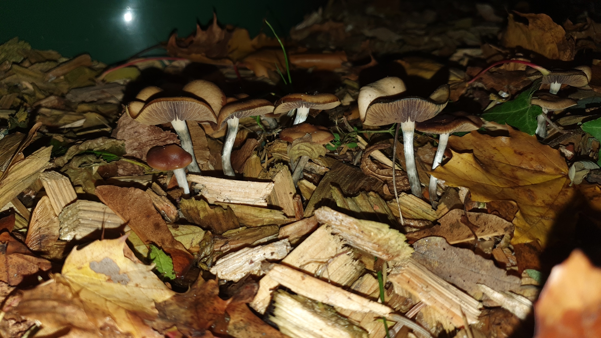 auf dem Heimweg durch den Park bin ich heute auf einem mit Holzstückchen bedeckten Beet auf diese Fruchtkörper gestoßen, die mir von Weitem nach Galerina marginata aussahen. Von nahem fehlte dann u.a. der typische Geruch und die Ringzone. Mit etwas Fantasie weisen Stiele und Hüte blauende Stellen auf (für mich eher schwarz), weshalb ich Psilocybe cyanescens für naheliegend halte. Wäre ein persönlicher Erstfund. Gibt es sonst noch Alternativen hier?