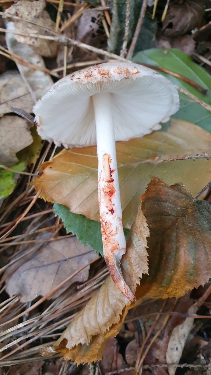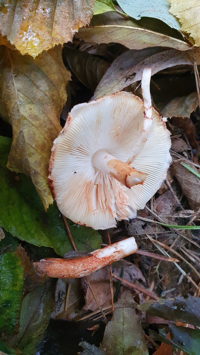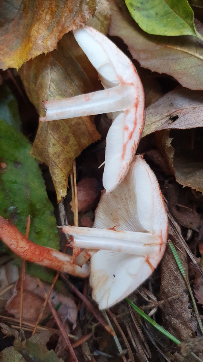 ich habe heute im Mischwald auf nährstoffreichem Boden diesen Fruchtkörper gefunden. Weitere Exemplare waren leider nicht aufzutreiben. Der Pilz war innerhalb von Sekundenbruchteilen wie blutverschmiert an Stiel und Hut. Der Stiel war extrem brüchig, weshalb er mir auch beim Entnehmen leider abgebrochen ist. Den Geruch würde ich als leicht mehlig bezeichnen.