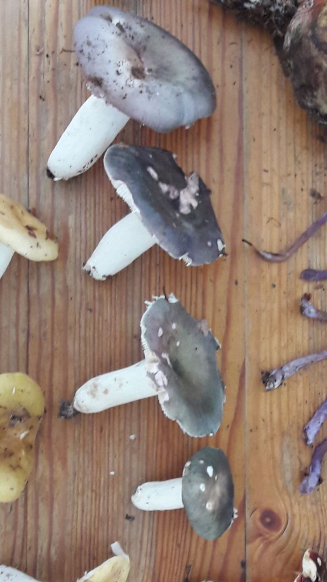 Folgende Exemplare habe ich in einem Buchenwald gefunden (Sorry für die Bildqualität). Hutfarbe bei den größeren drei von gelb/grün zu violett übergehend. Geruchlich alle unauffällig. Geschmack bei allen mild, Stiele fest, nicht hohl. Lamellen brüchig (wie man sieht, hab ich das ausgiebigst getestet).
