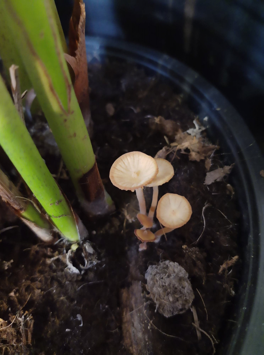 Vorkommen im Topf einer Palme im Gewächshaus auf morschem Holzstück
