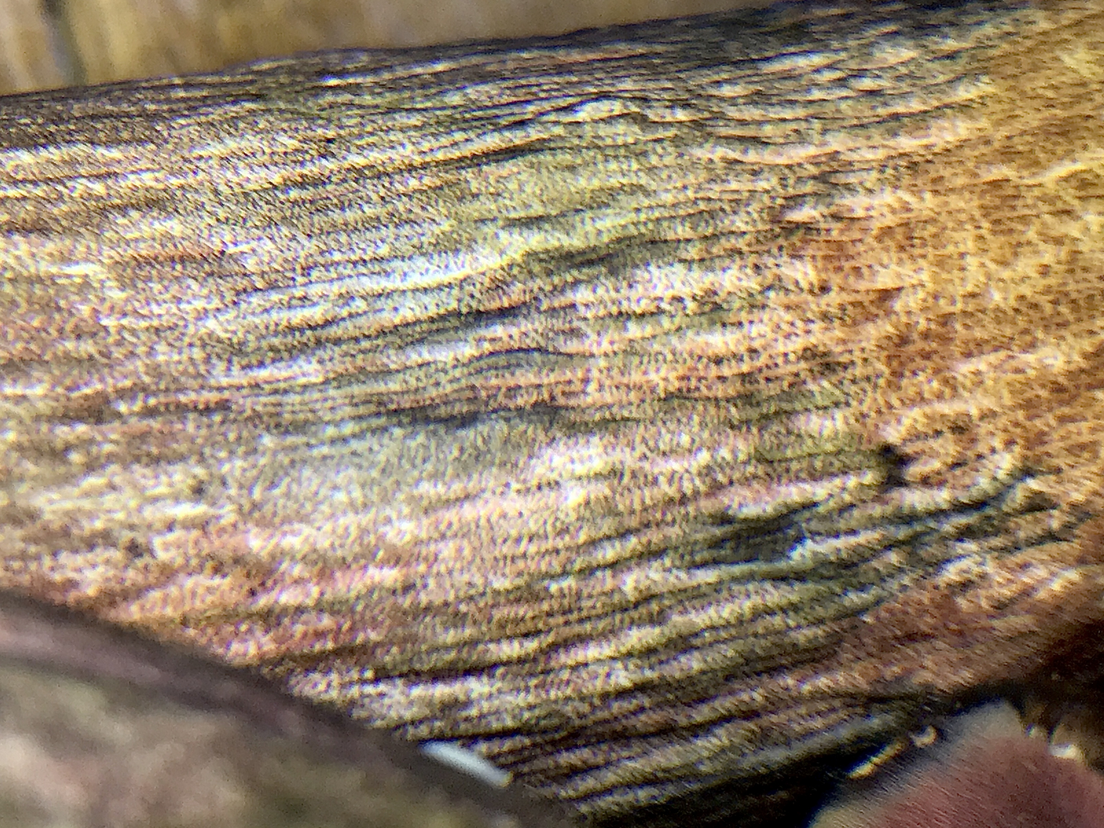 Selbst unter der Lupe erkenne ich nicht wirklich Flocken, eher rötliche Farbtupfer, aber kein Netz.